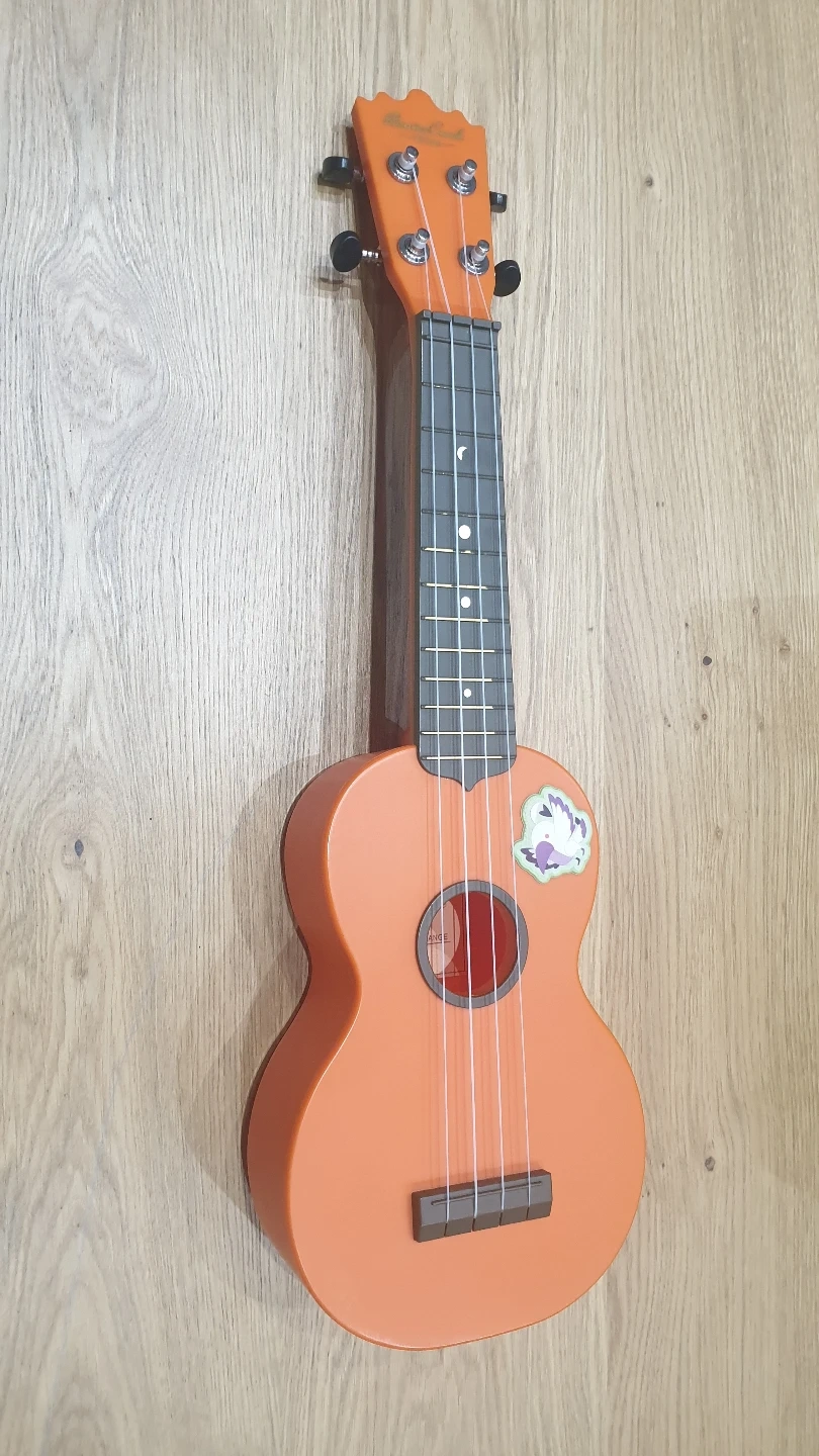34Orange plastic ukulele Good condition. it's bit old, but sound great and easy to play. have some damege, no problem to play good for children and beginners come with black bag more information for DM