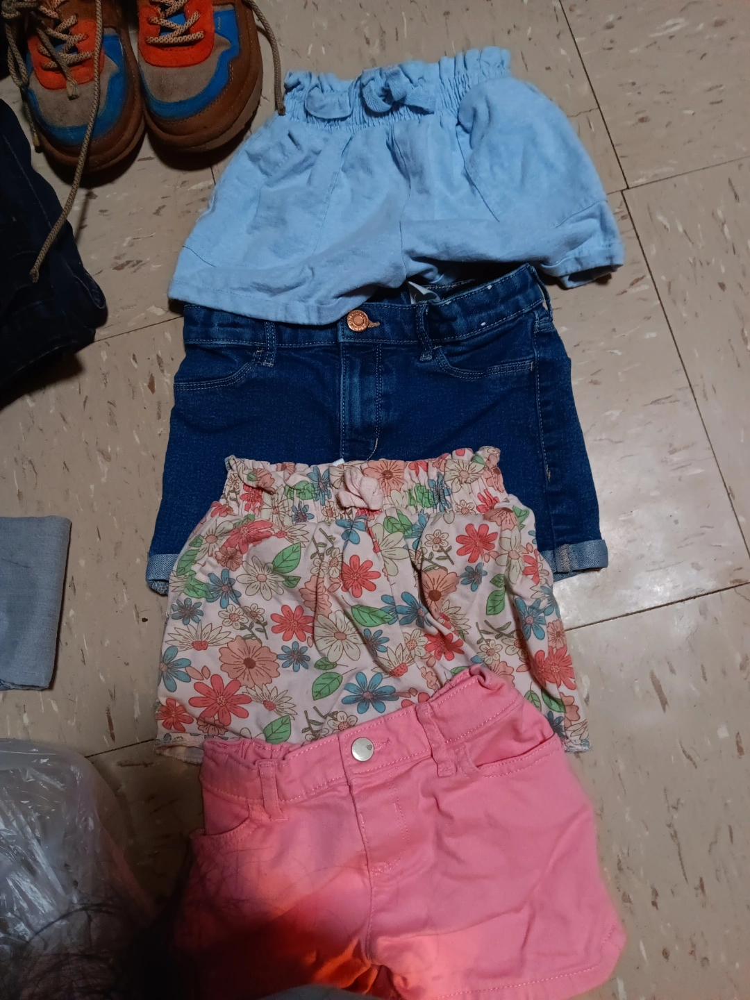 Bundle of four girls' shorts. Includes denim, light blue, floral print, and pink shorts. Good used condition.