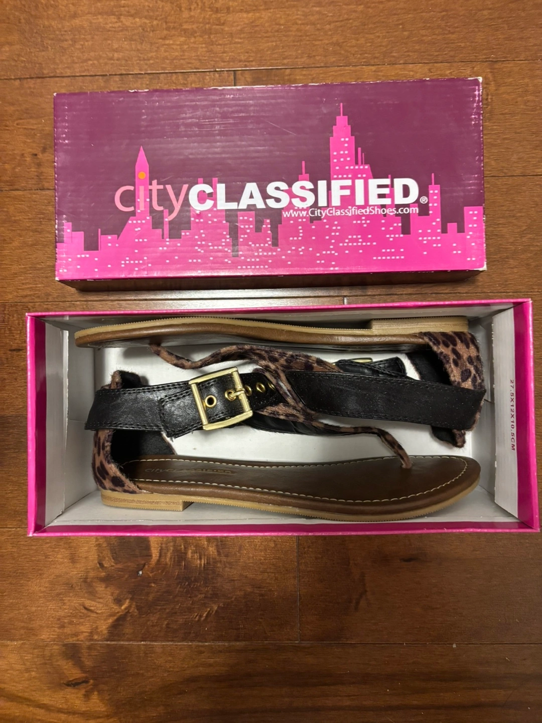Women's sandals. Leopard print and black. Adjustable buckle closure. Brown sole. In original box.