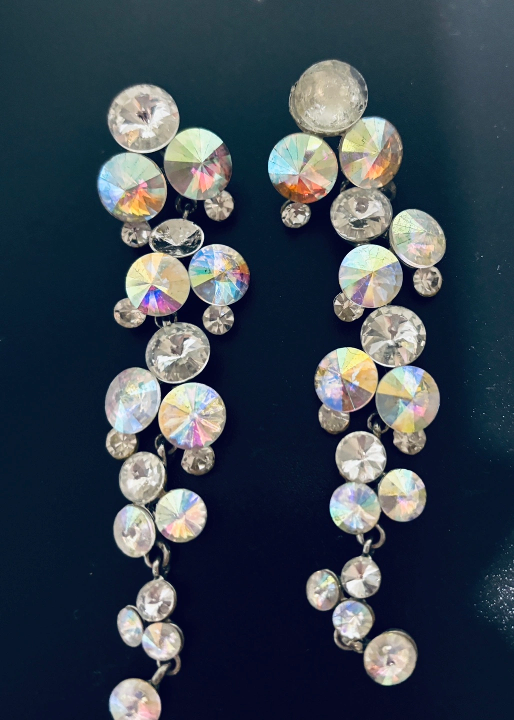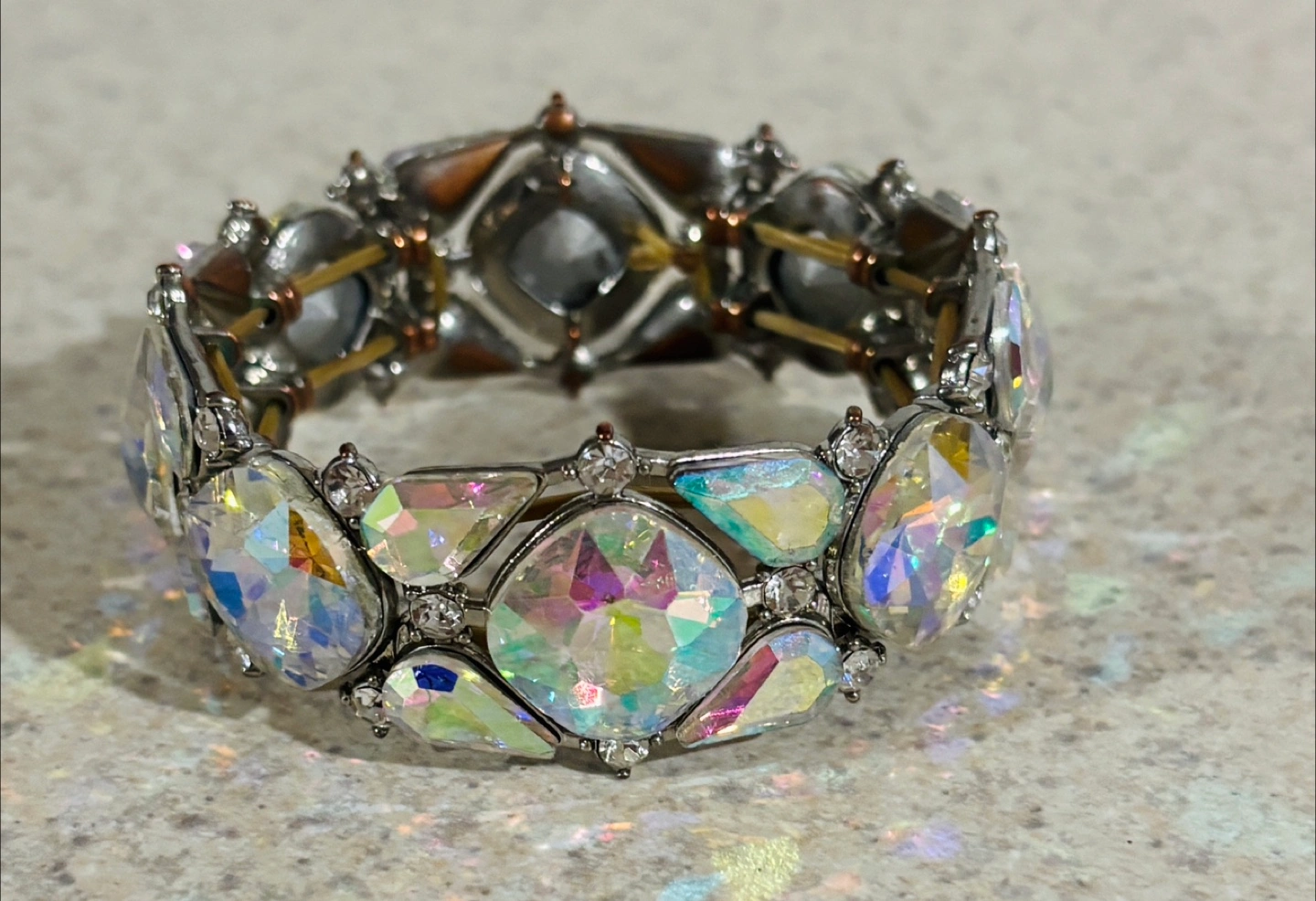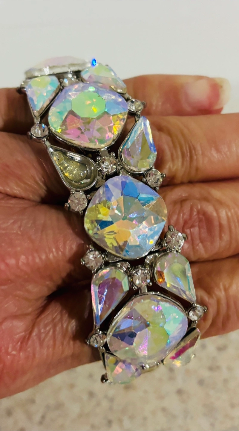 25Stunning iridescent crystal jewellery set. Features a stretch bracelet with faceted stones and long, sparkling dangle earrings. Perfect for a special occasion.