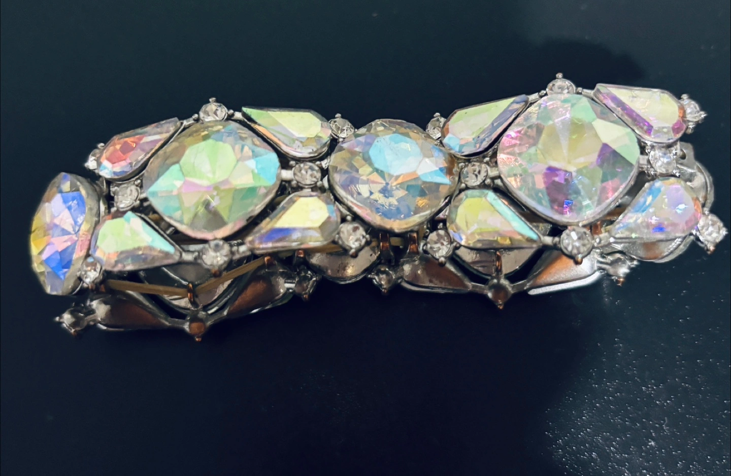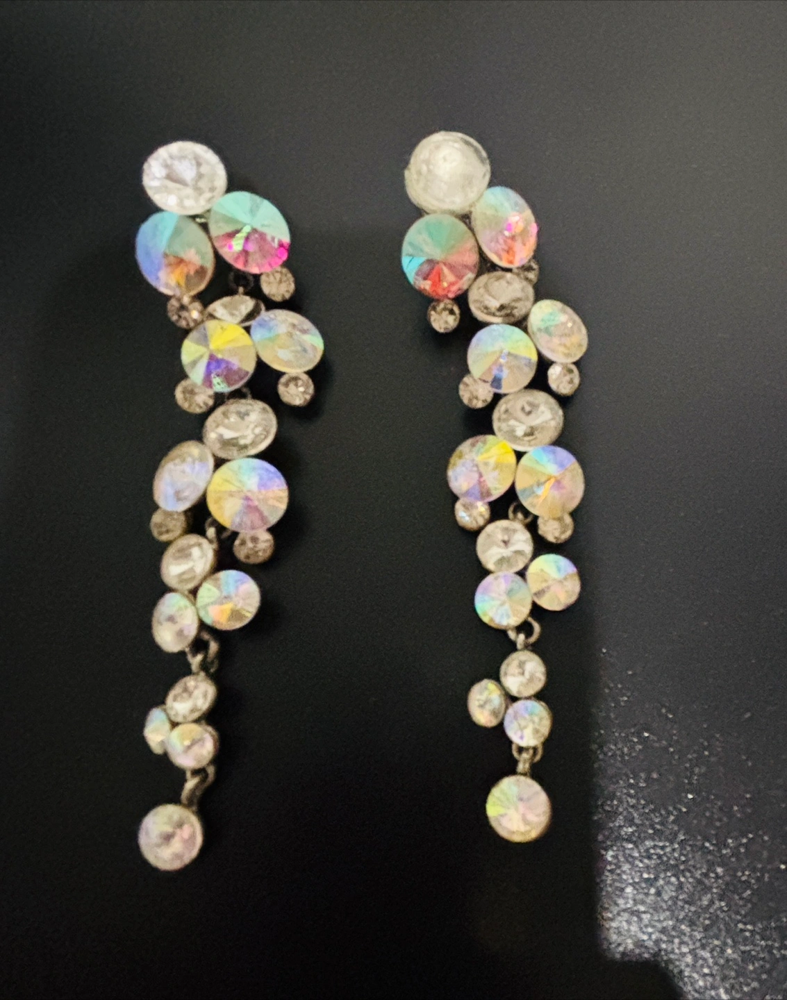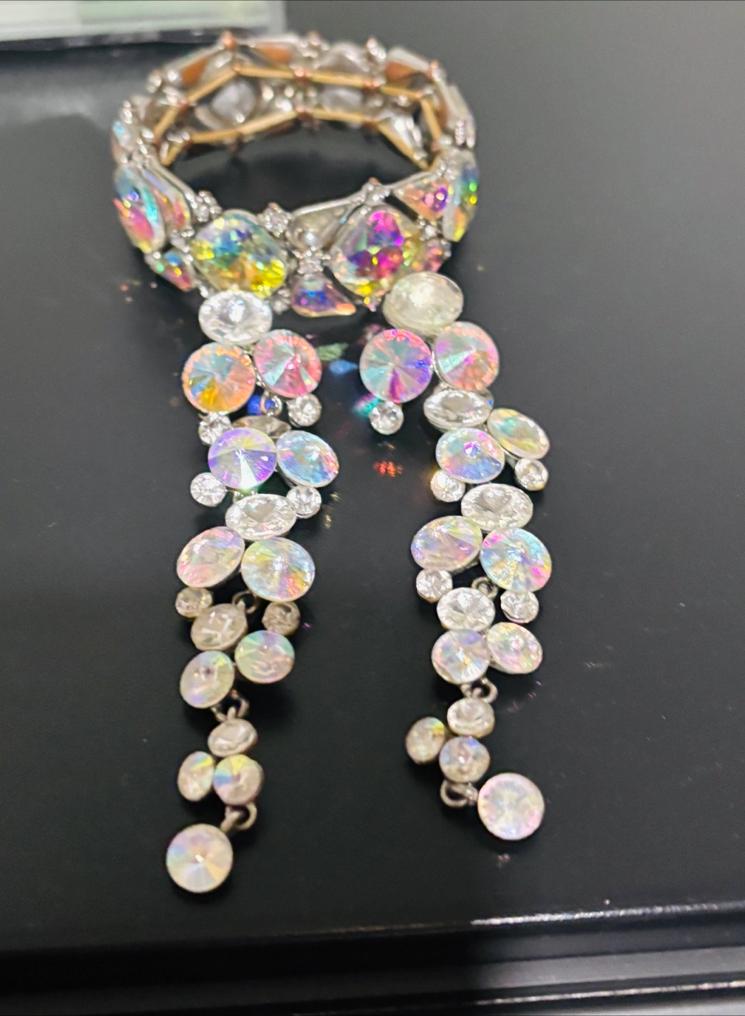25Stunning iridescent crystal jewellery set. Features a stretch bracelet with faceted stones and long, sparkling dangle earrings. Perfect for a special occasion.