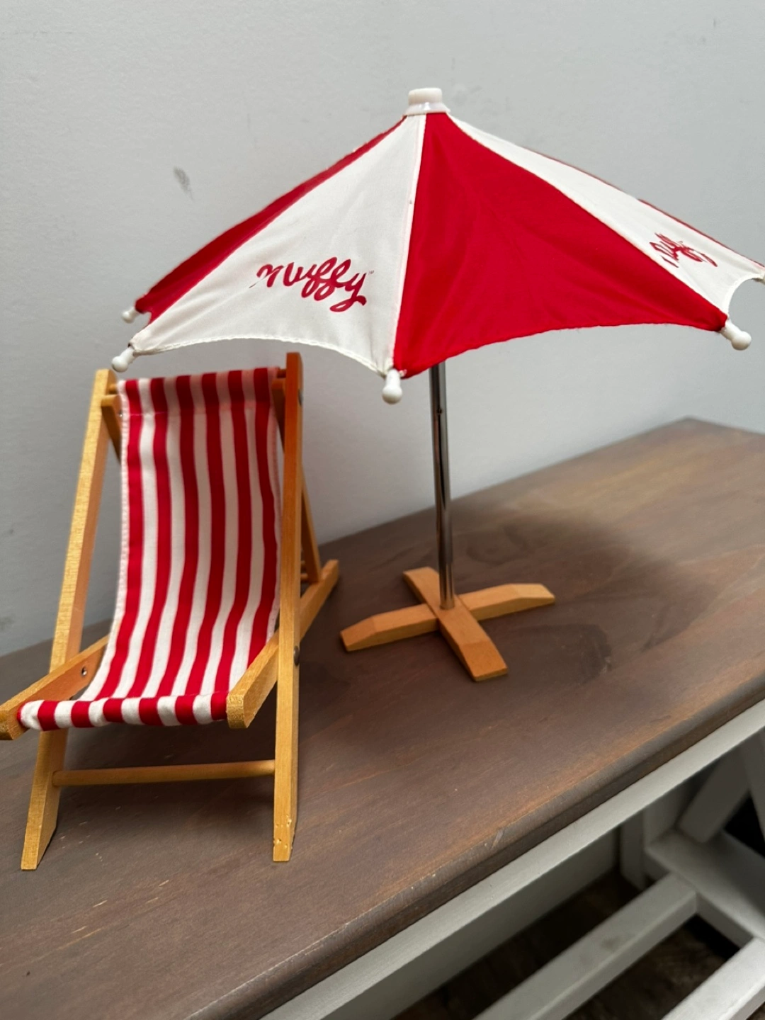 Adorable miniature beach chair and umbrella set. Perfect for dollhouses or decoration. Red and white striped design. Wooden chair, metal umbrella stand.