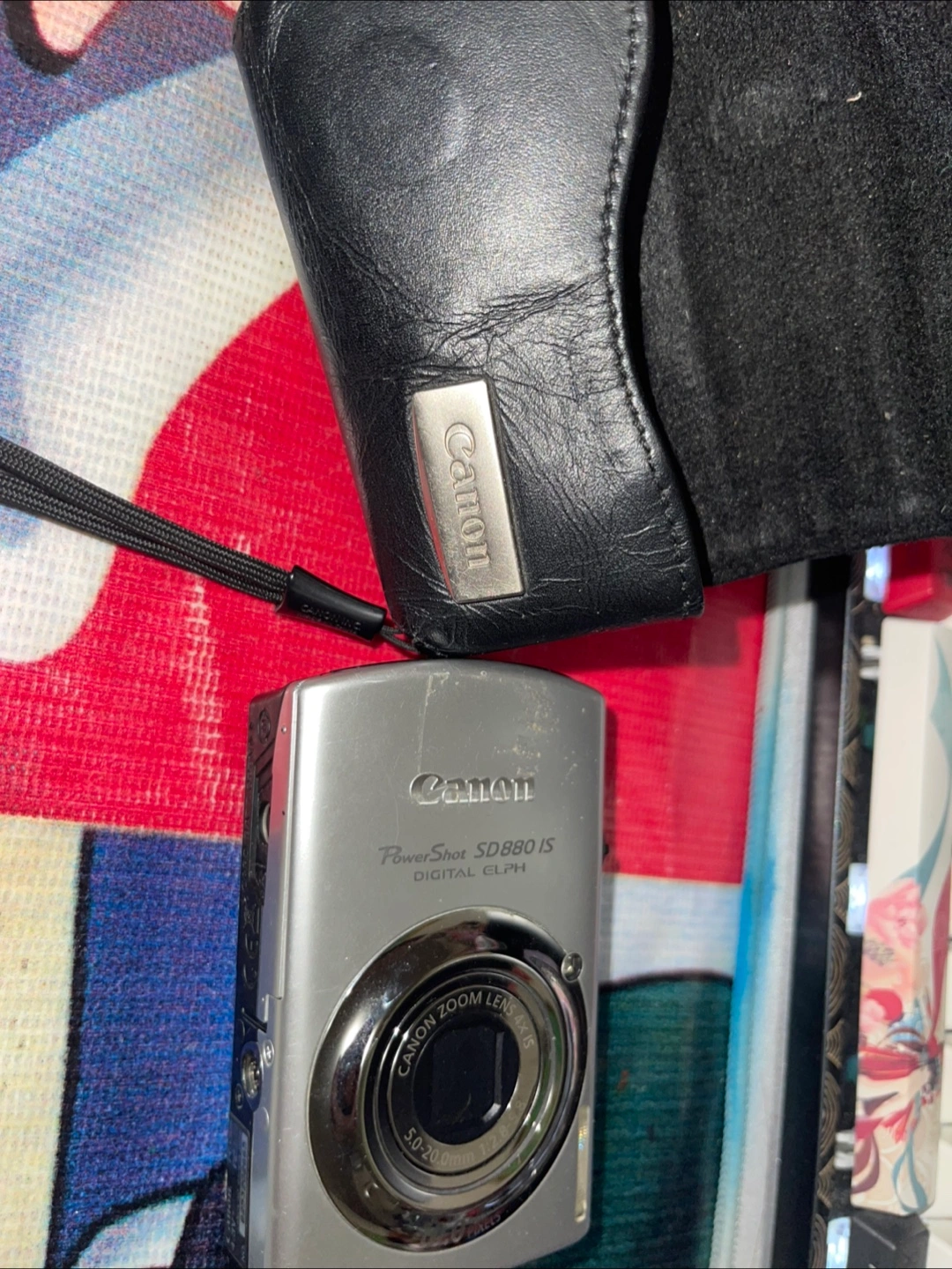 Vintage Silver Canon PowerShot SD880 IS digital camera. 10.0MP. Includes a black leather carrying case. Used condition.