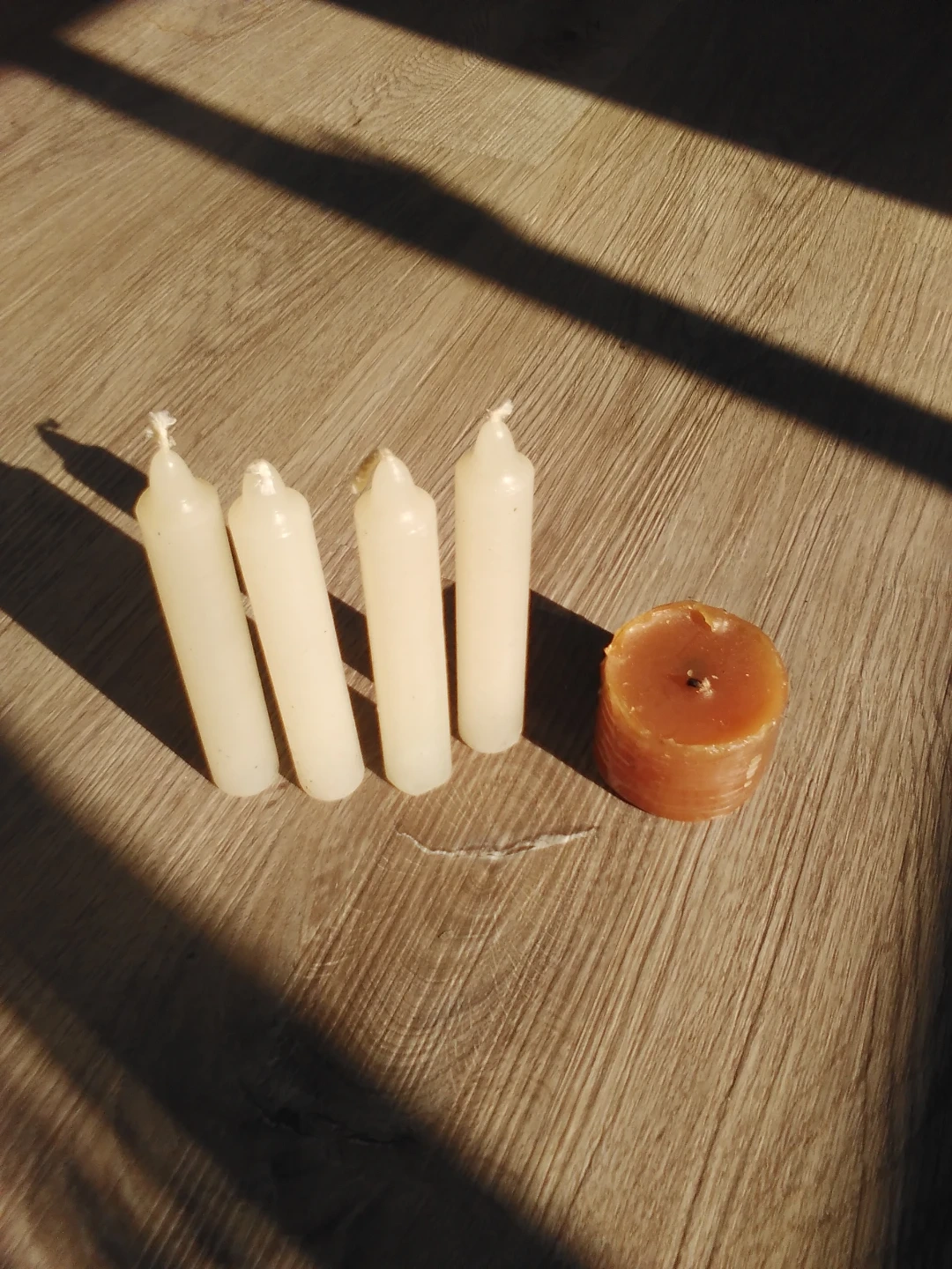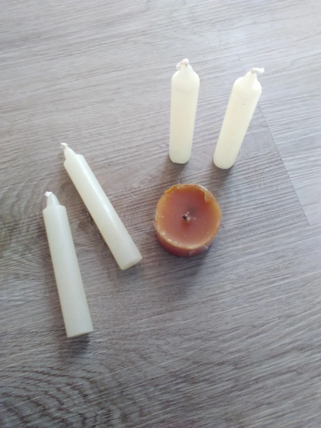 Four white candles about 4.5" tall and one used 1.5" tall dark beige votive candle. Some specks got on the white candles so you might want to clean that off.