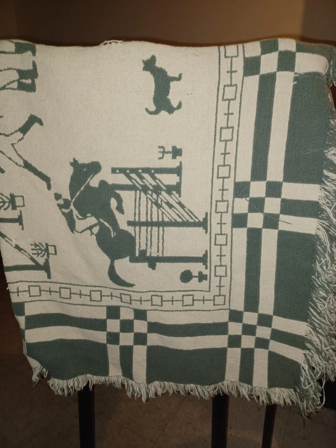 Cream and green woven throw blanket. Features horses jumping hurdles and other equestrian designs. Fringed edges. Nice for adding a touch of country style to your home decor.