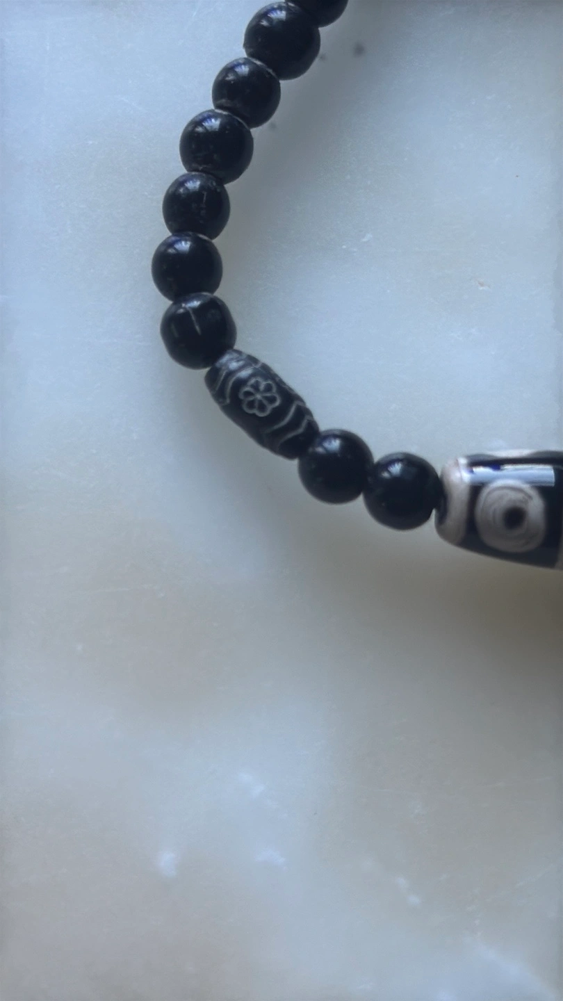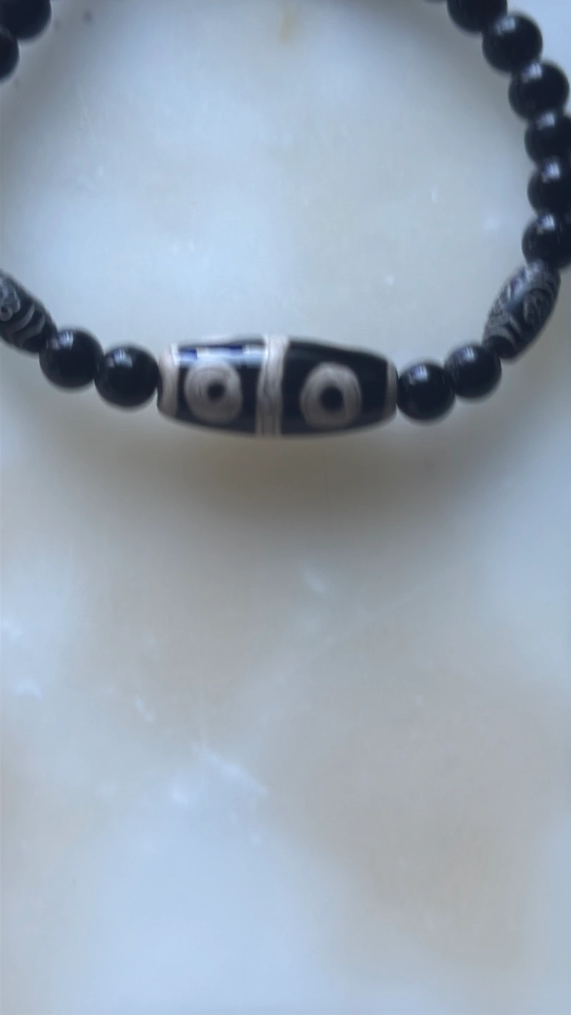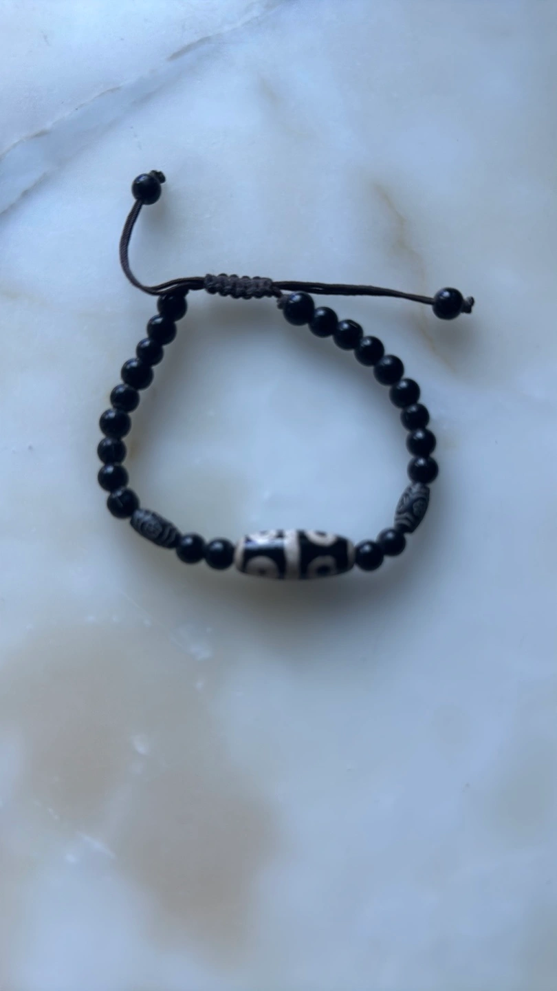 110Unique bracelet. Features black beads and a central dzi bead charm. Adjustable closure. Perfect everyday accessory.