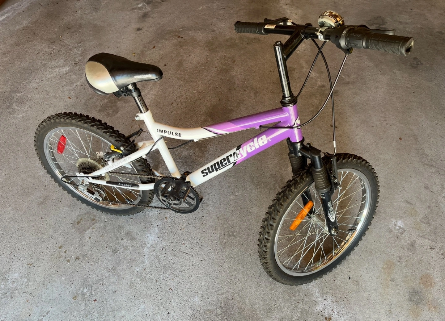 Used Supercycle Impulse bike. Purple and white frame. Front suspension. Five-speed. Good used condition.