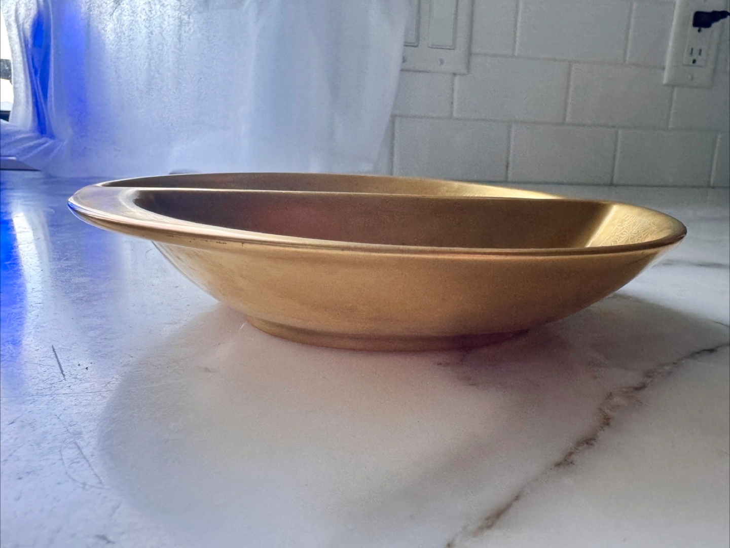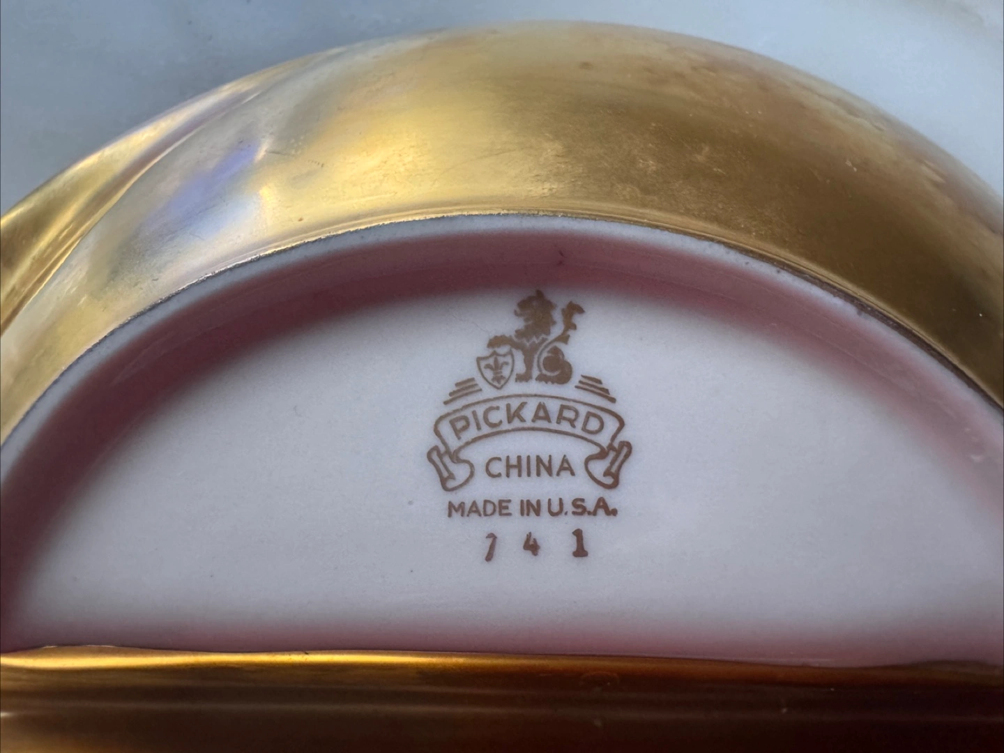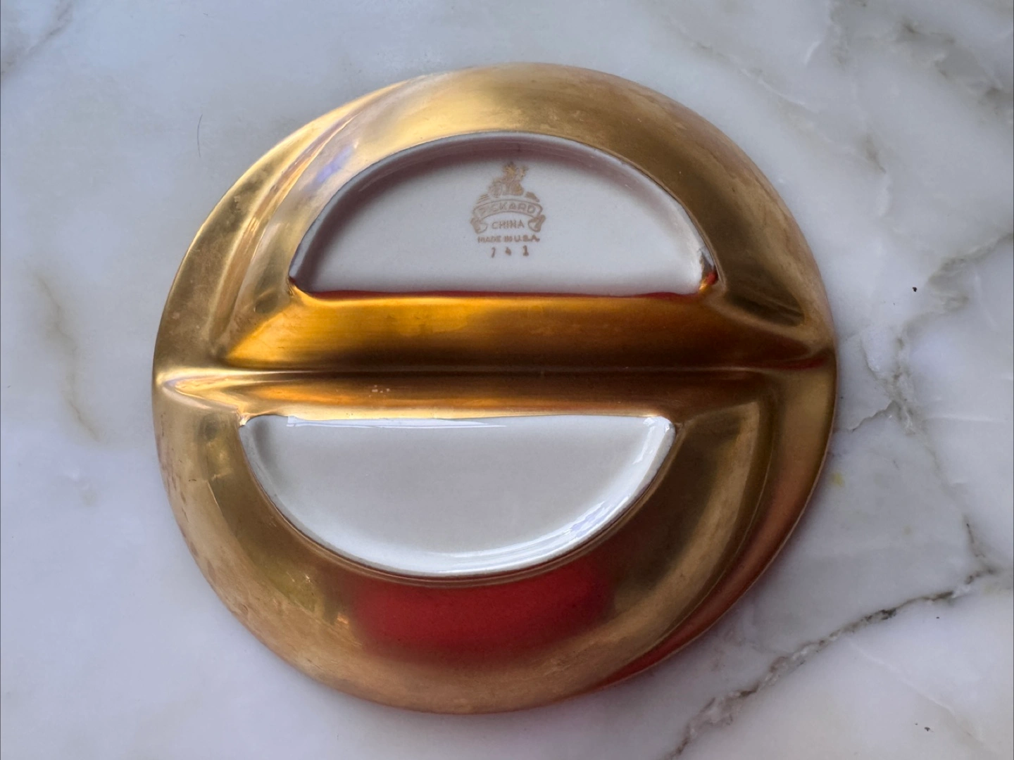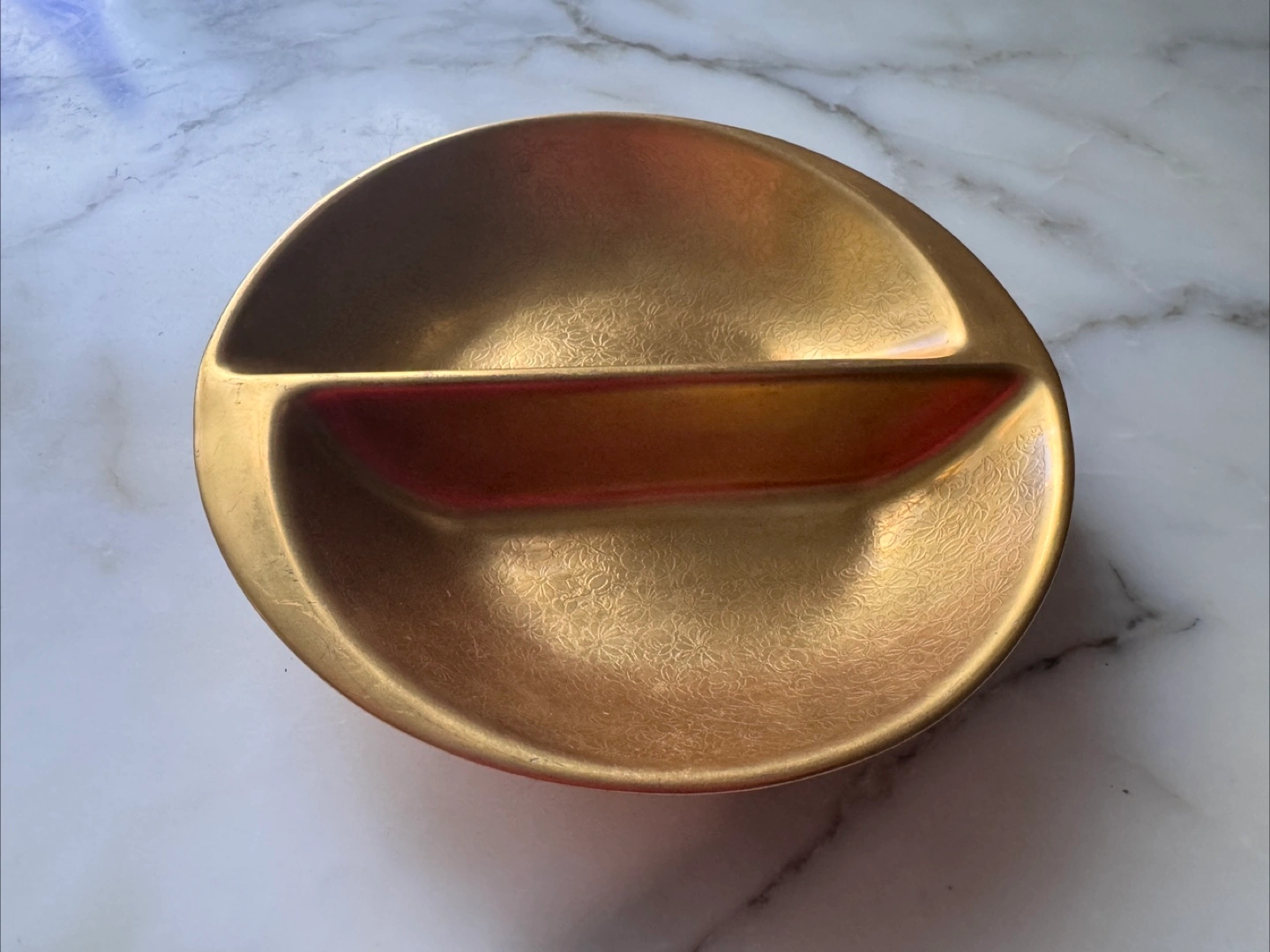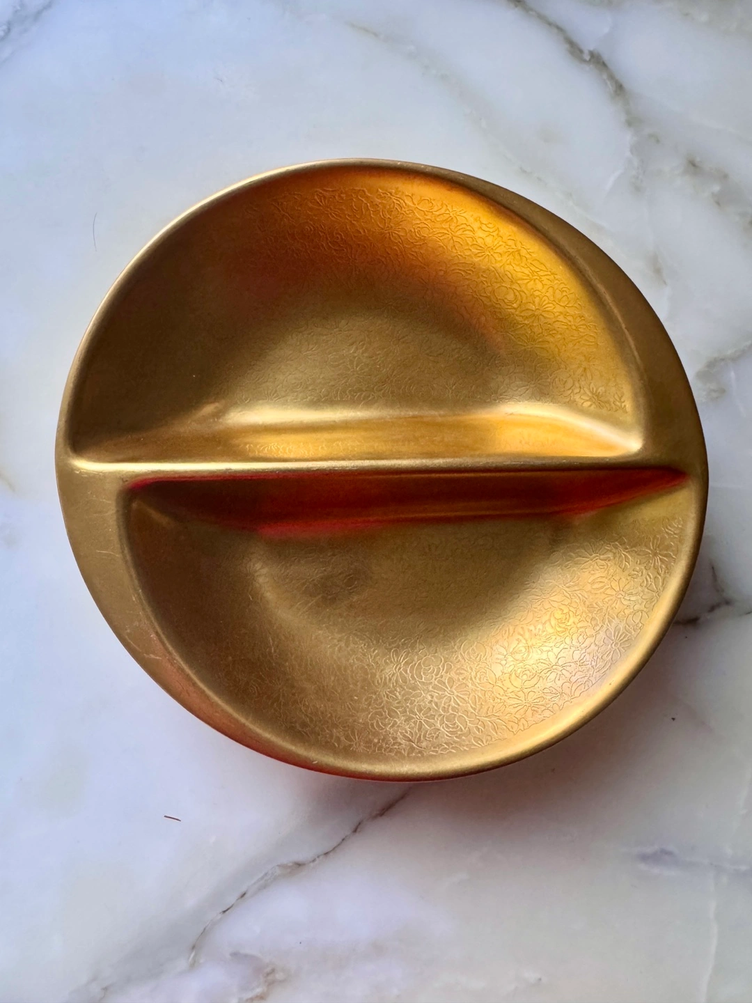 110Gold-toned divided dish. Two sections. Made in the U.S.A. Shows some minor wear.