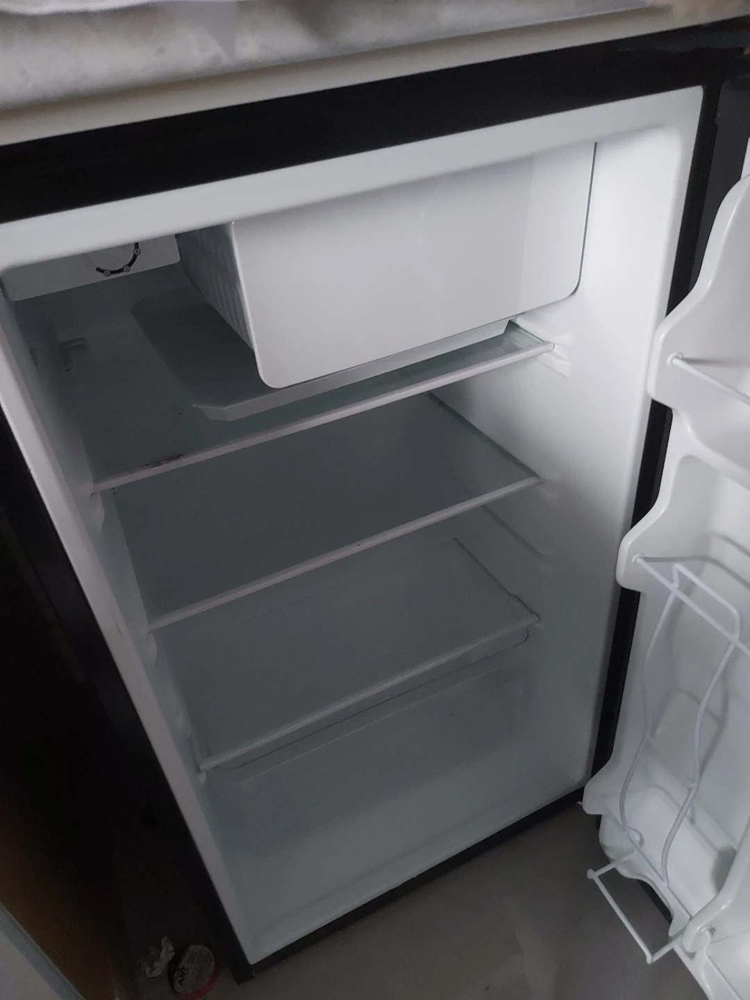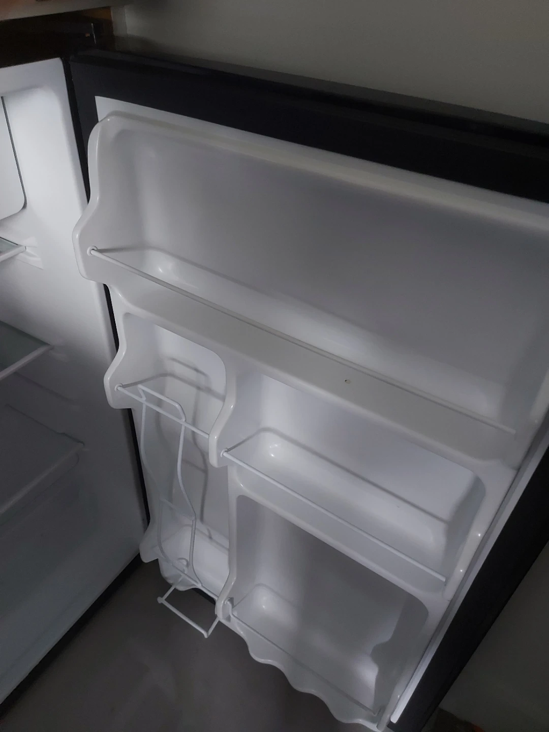 Black mini fridge with internal shelves and door storage. It's a compact and convenient cooling solution. It would be useful for a dorm room or small office space.