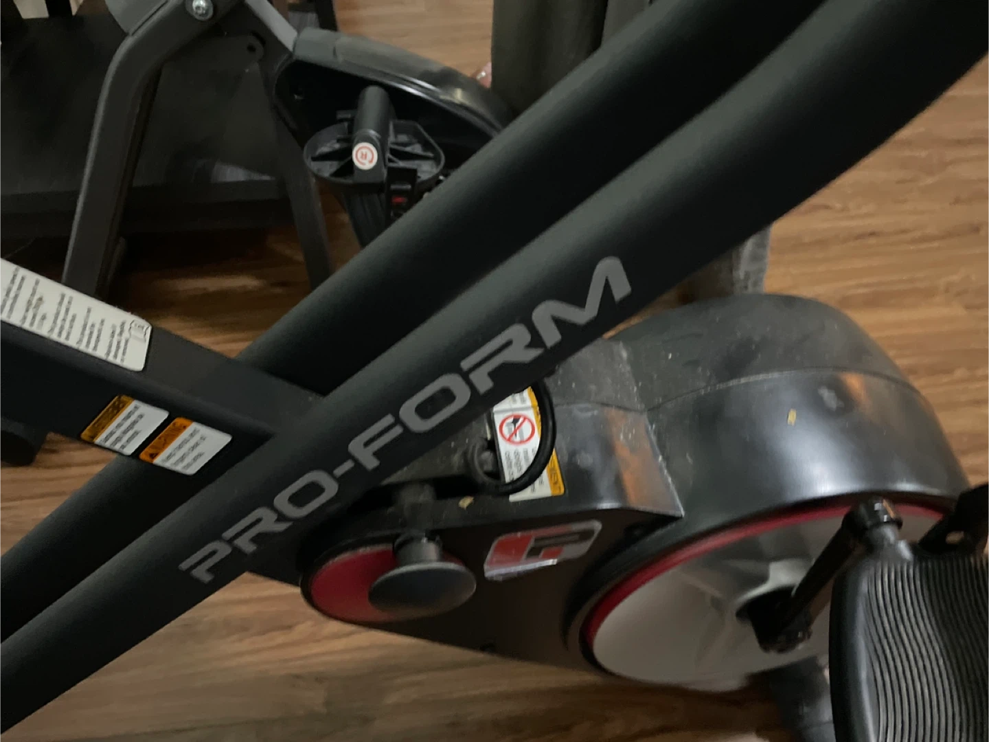 This is a Pro-Form stationary exercise bike. It features a comfortable seat and adjustable resistance. Perfect for home workouts!