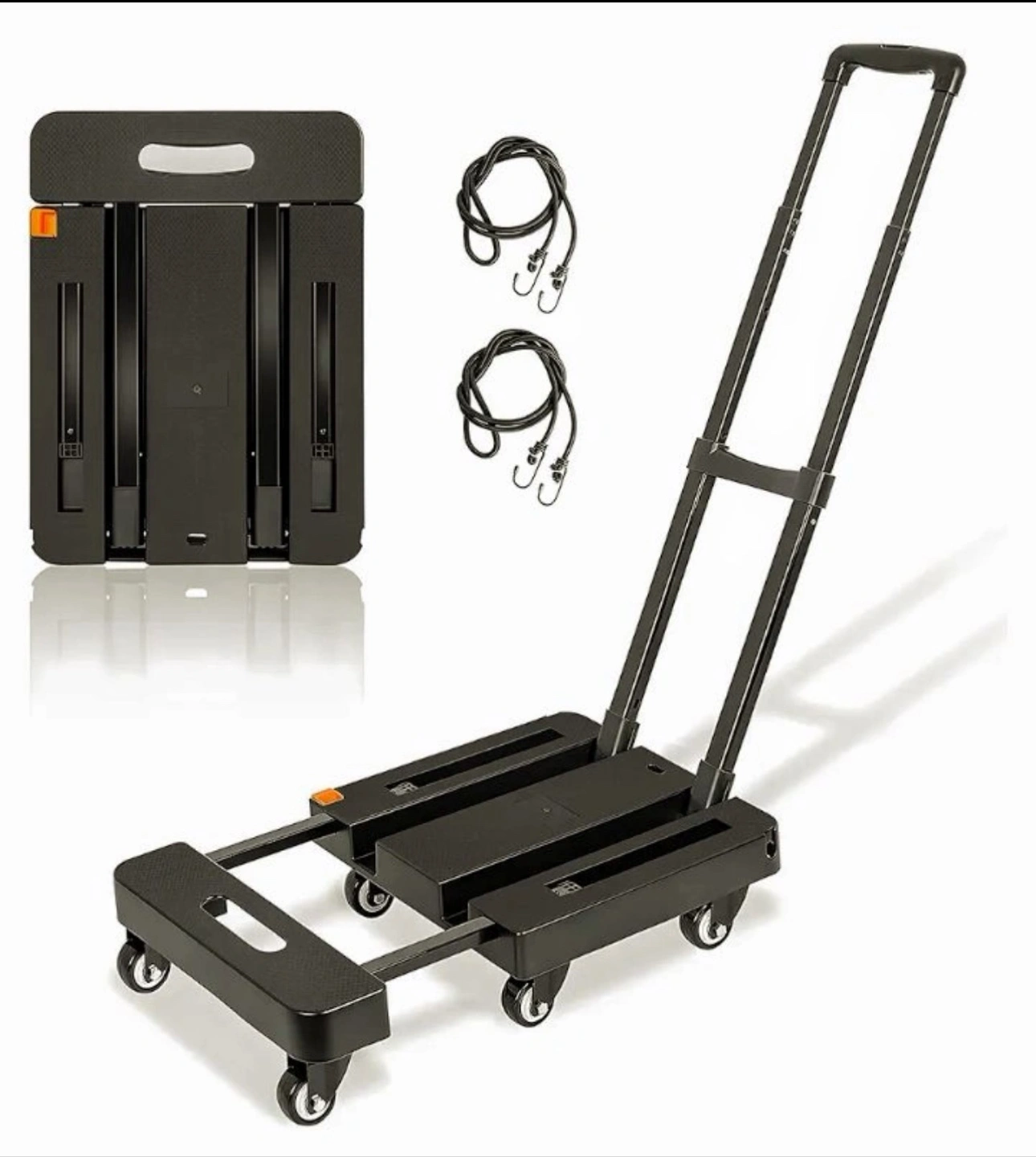 360° rotating wheels. Solid construction. Heavy duty. 500 lbs capacity. Luggage, shopping, moving & office use. Retractable base. Stretchable. Black.