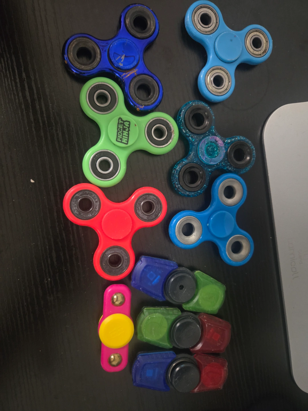 Assorted colours and styles. Some spinners show minor wear. Includes several small fidget toys. all for $15 only