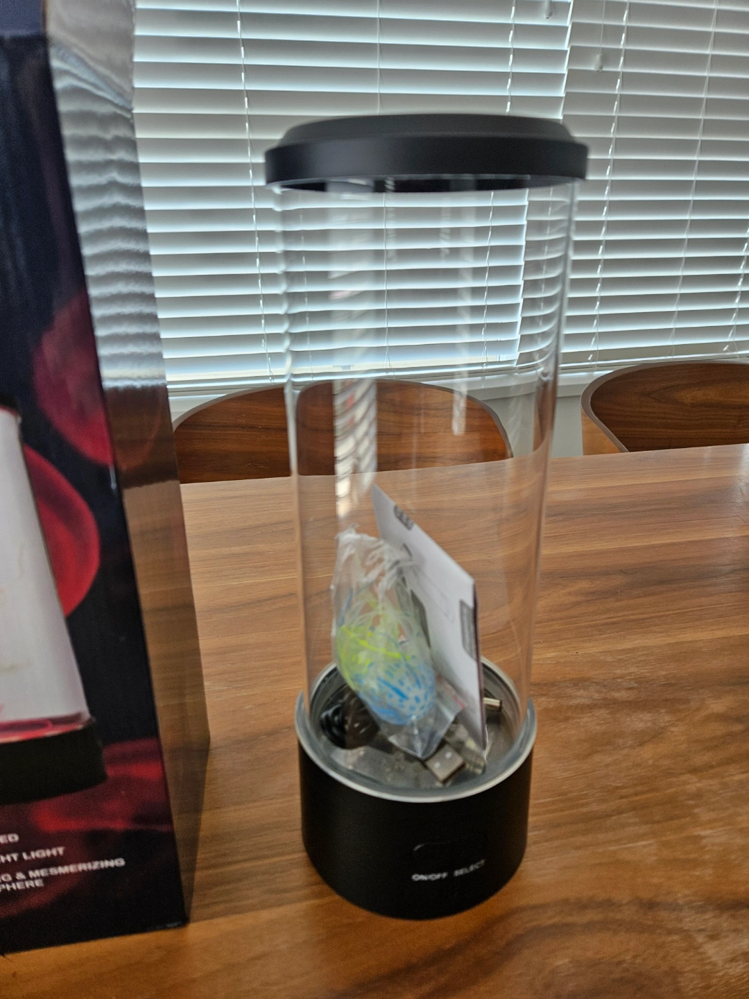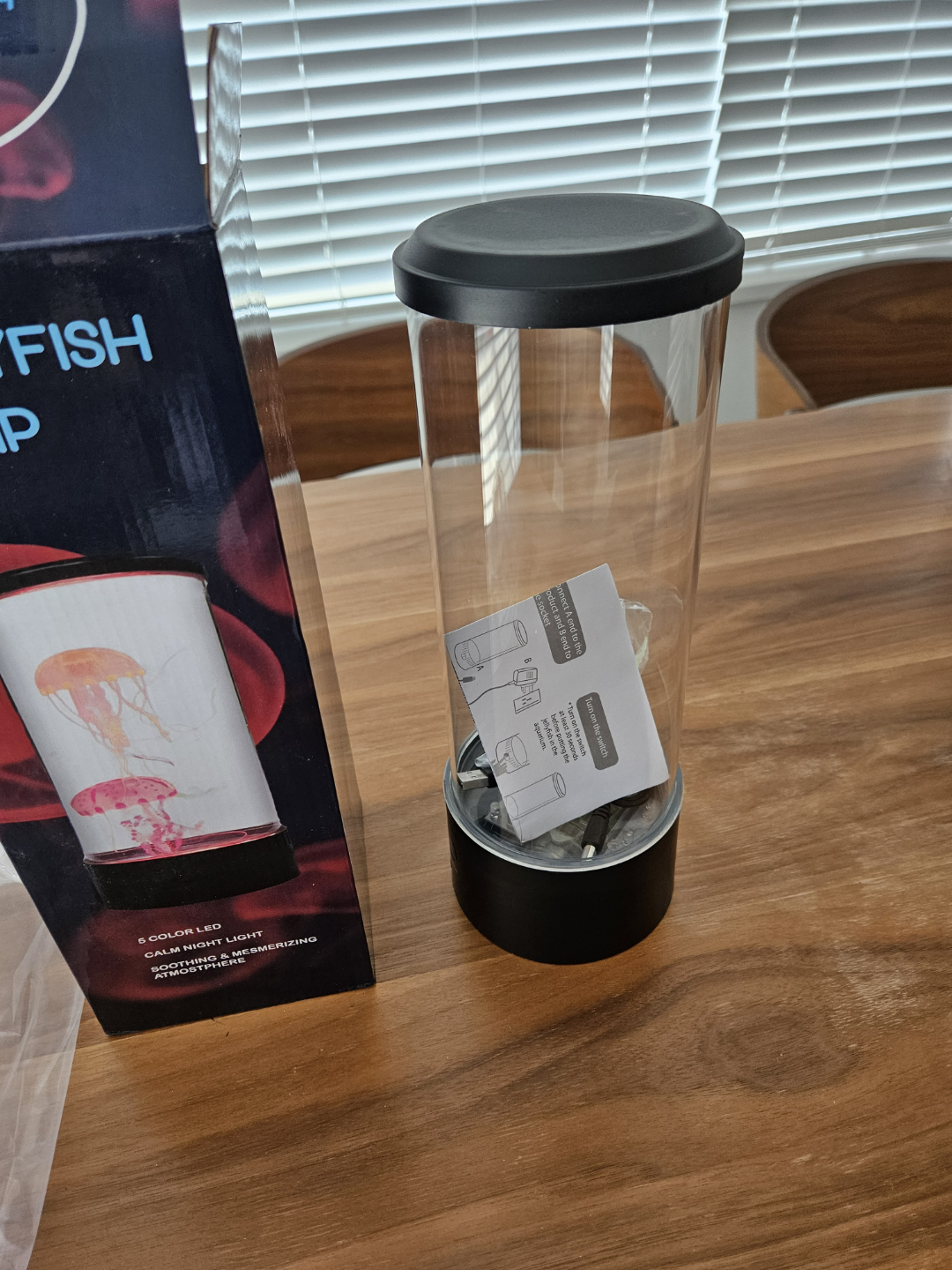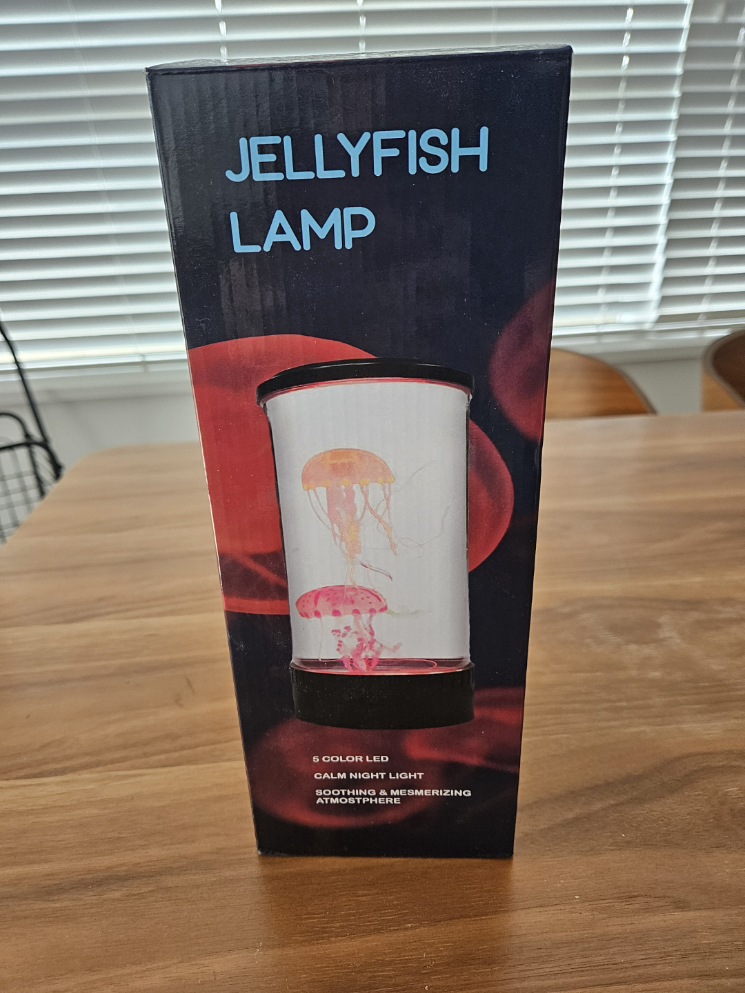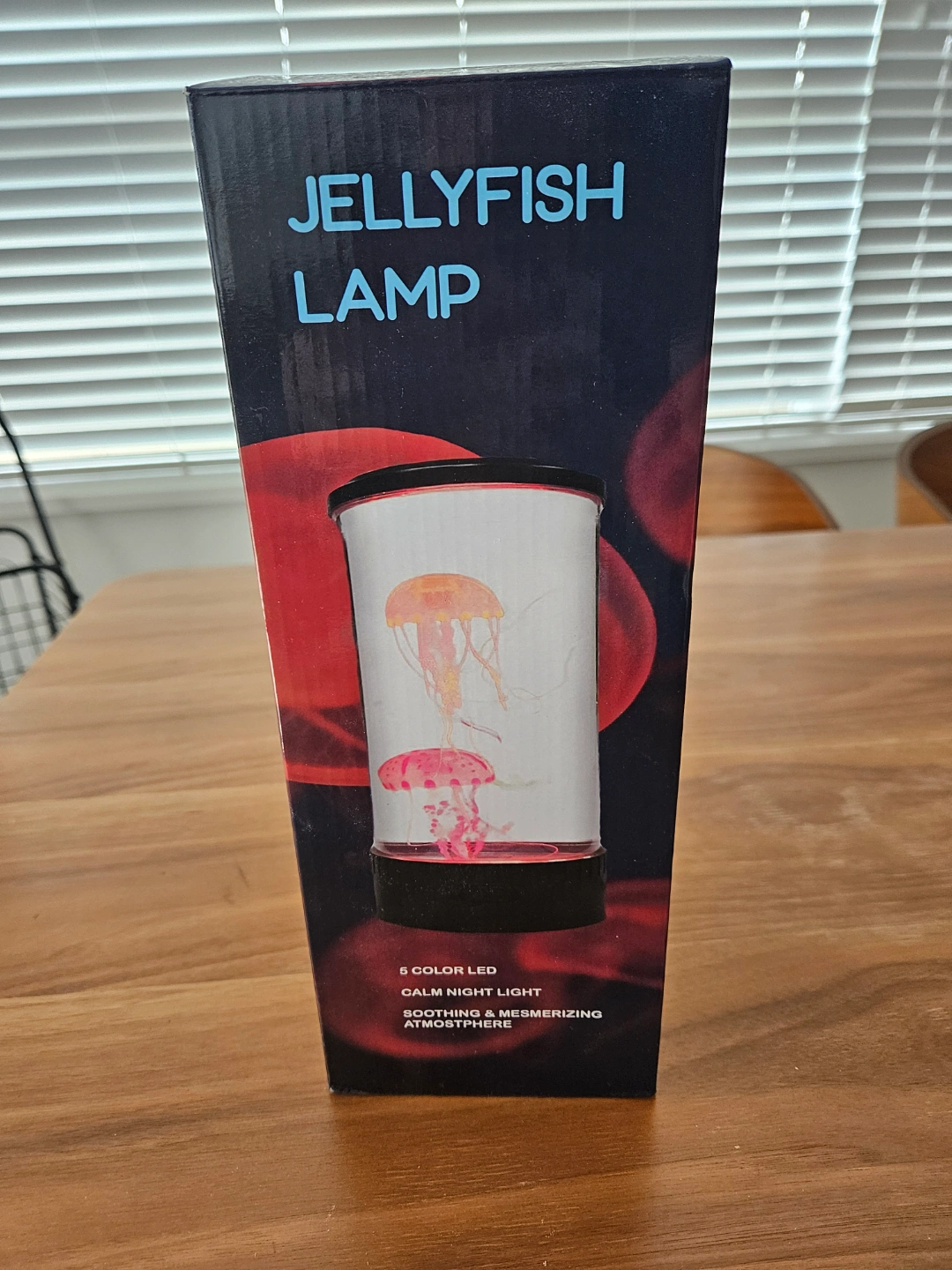 Soothing and mesmerizing atmosphere. Brand new LED jellyfish night light. Clear acrylic cylinder. Black base. USB powered. ideal for kids(8yr +) bedroom or living room decor.