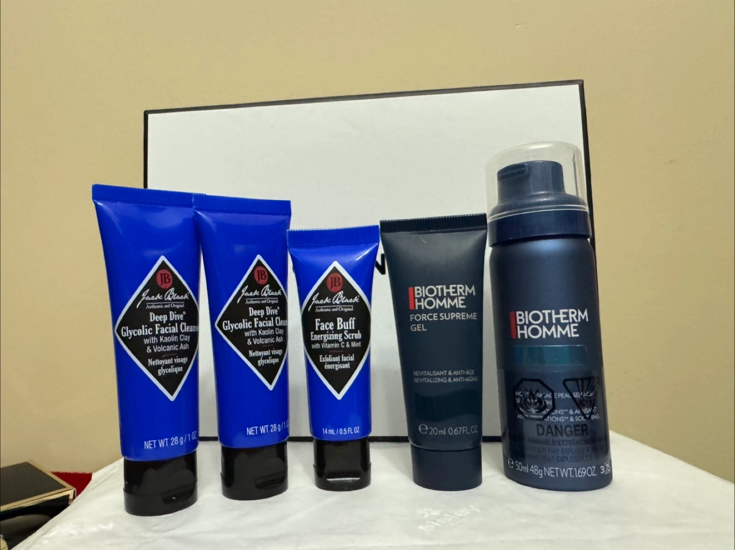 Men's skincare set. Includes JB Facial Cleanser (two tubes), JB Face Buff Energizing Scrub, and Biotherm Supreme Gel and Biotherm face wash.