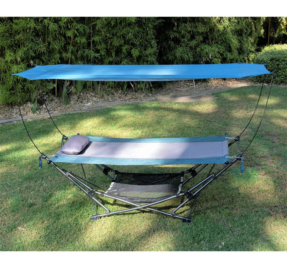 Lightweight, foldable hammock. Features a built-in shade canopy. Includes a carrying case. Perfect for camping, backpacking, or relaxing outdoors. Durable and easy to assemble.