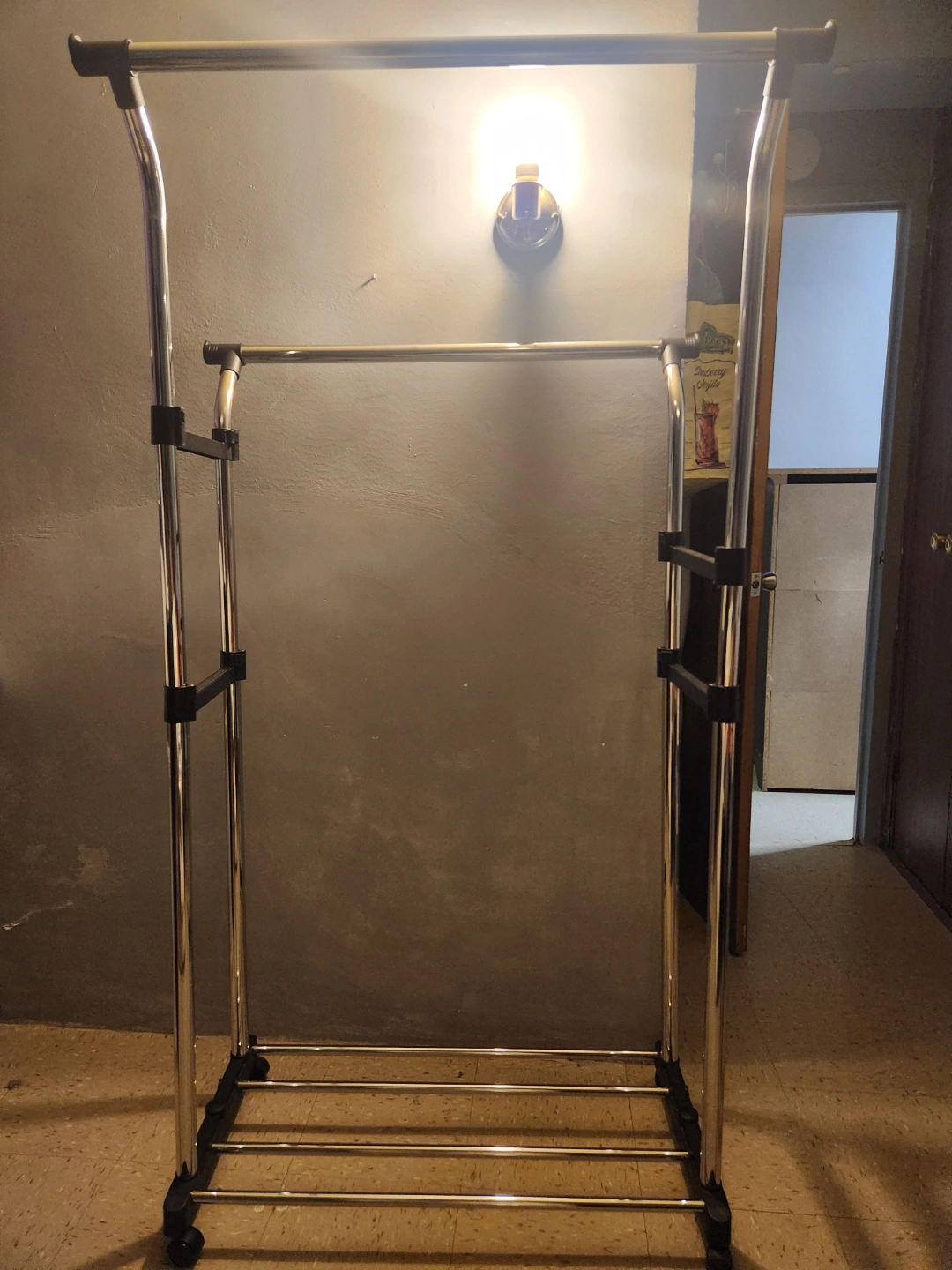 Double hanging rod. Sturdy metal frame if you assembled correctly. Bottom shelf for storage. Wheels for easy movement.