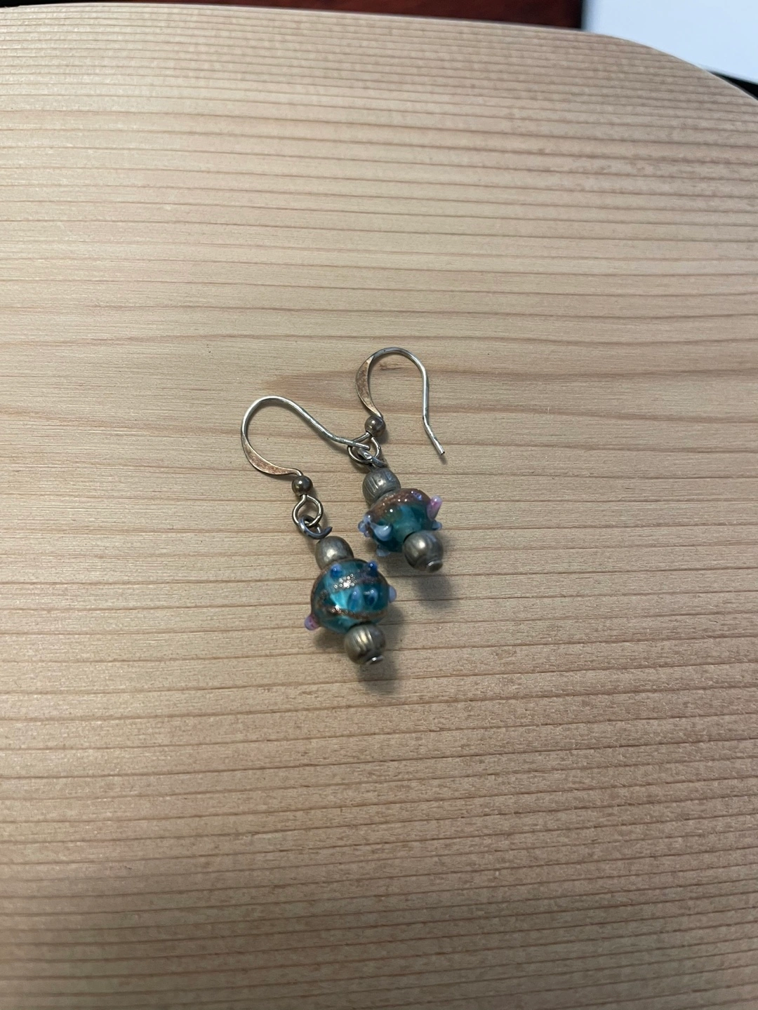Pair of dangling earrings. Features teal glass beads and silver-toned metal accents. Lightweight and eye-catching.