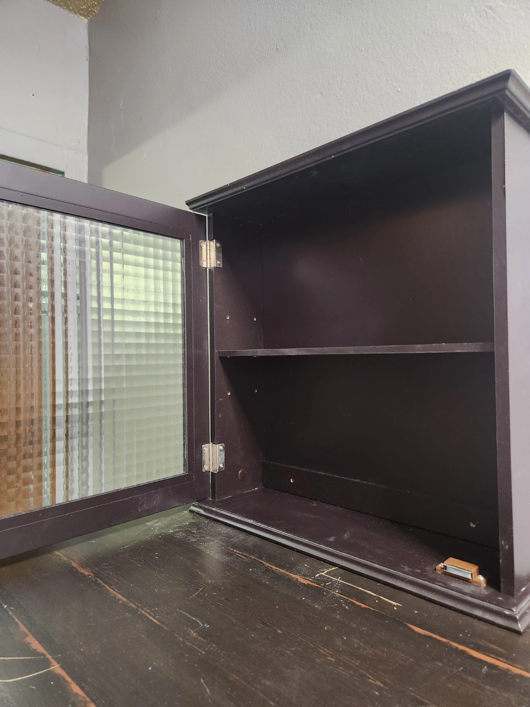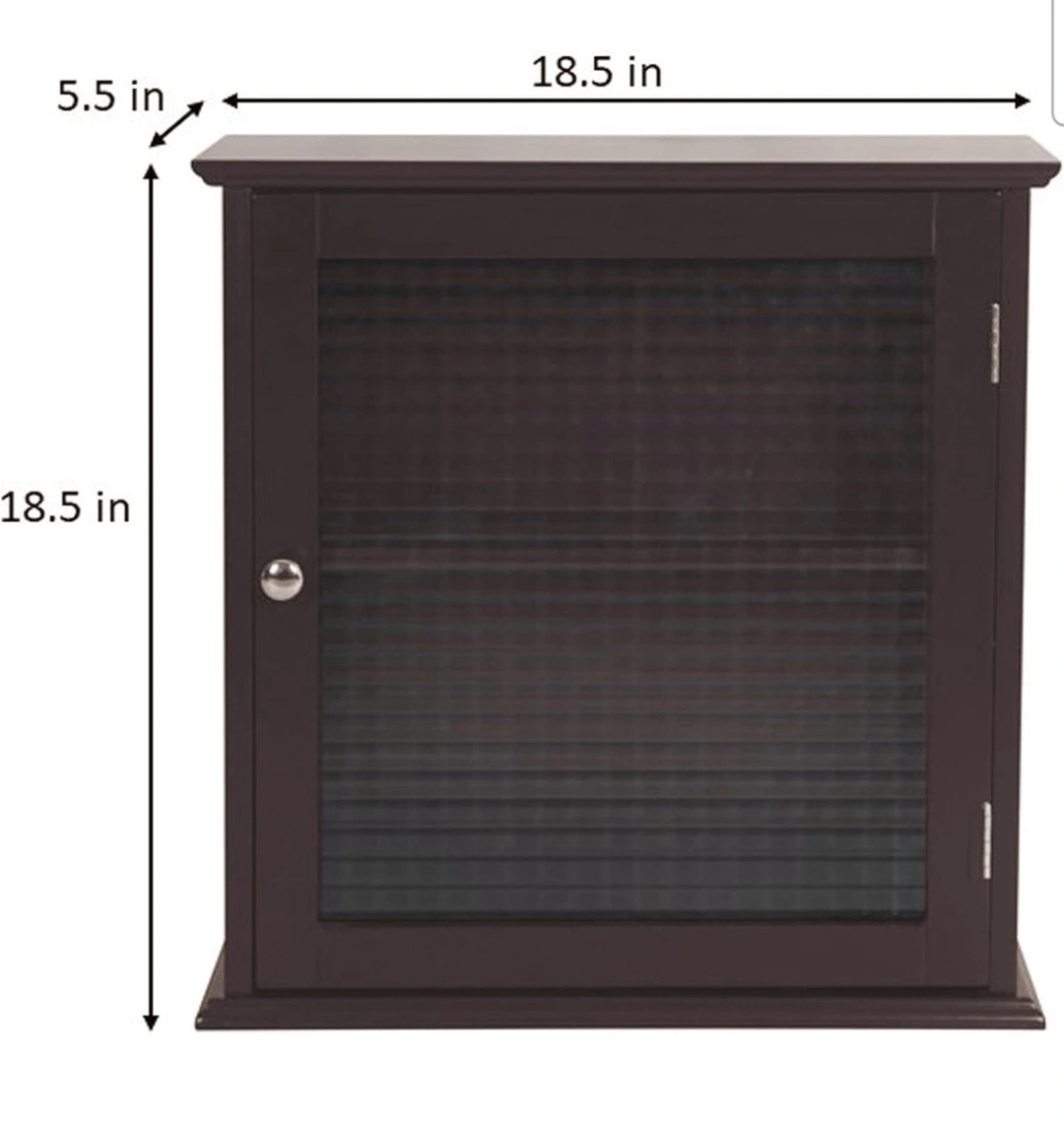 Small wall-mounted cabinet. Dark brown wood finish. Glass front with textured pattern. One shelf inside. Measures approximately 18.5" x 18.5" x 5.5". Perfect for bathroom or small space storage.
