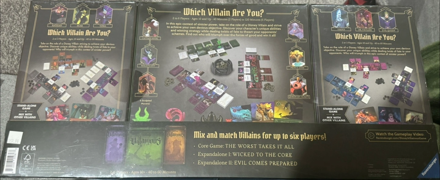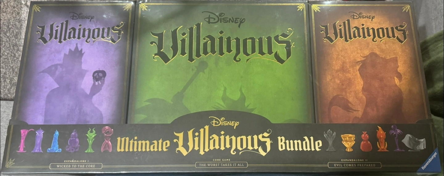Complete Villainous Bundle. Includes core game and two expansions: Wicked to the Core and Evil Comes Prepared. For 2-6 players. Ages 10+. Approximately 60-minute playtime. Still sealed.