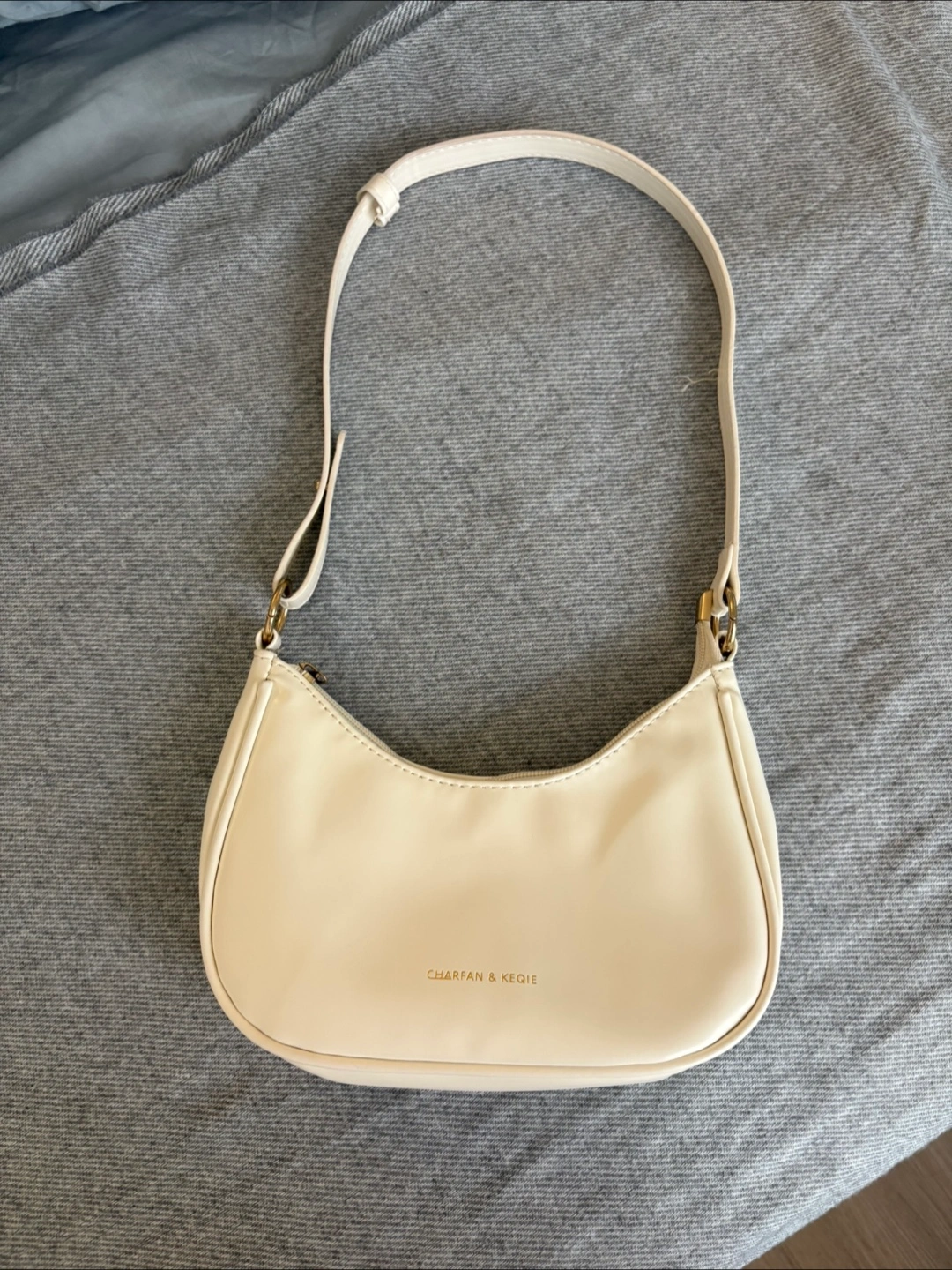 Adorable half-moon bag. Cream colored. Features gold-toned hardware. Adjustable strap. Zipper closure.