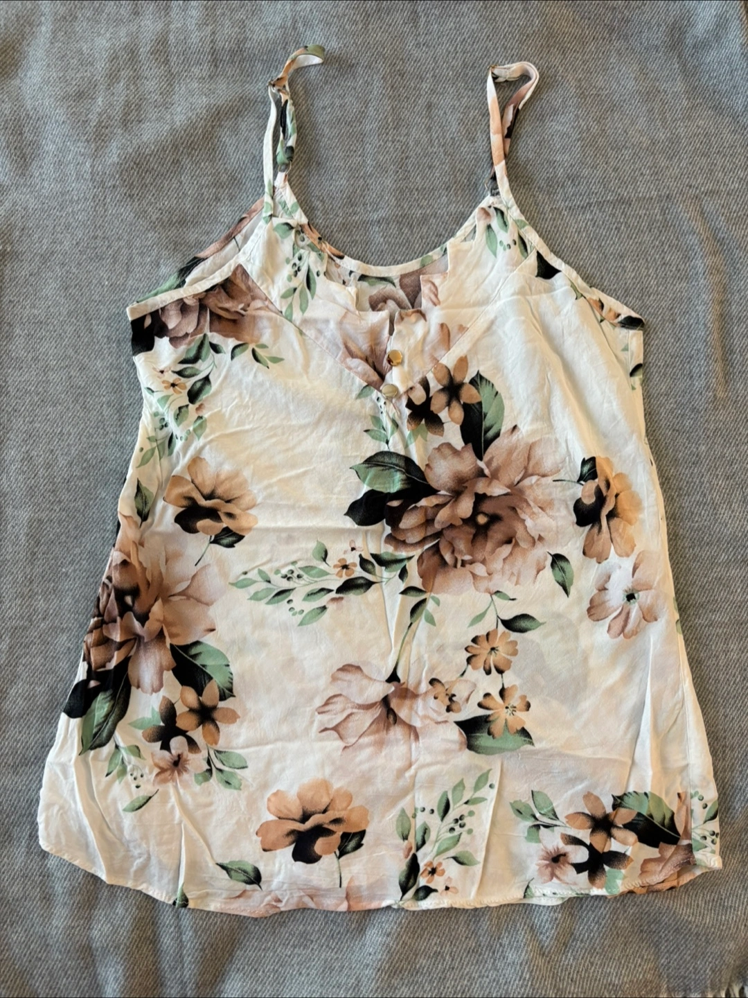 White floral sleeveless top. Features a button detail at the neckline. Relaxed fit. Lightweight material, perfect for summer!