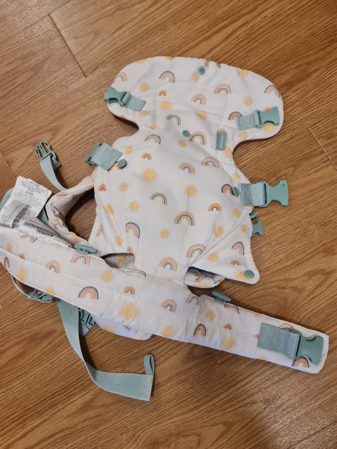 Infant baby carrier. Features adjustable straps and a cute rainbow and sun pattern. Lightweight and comfortable.