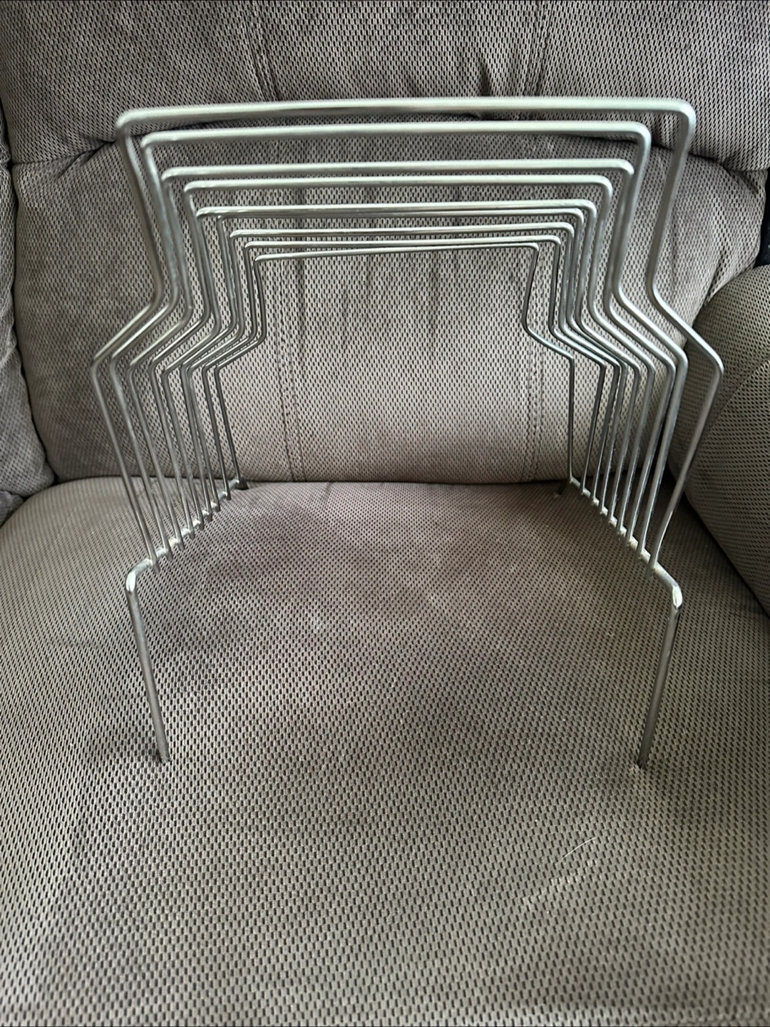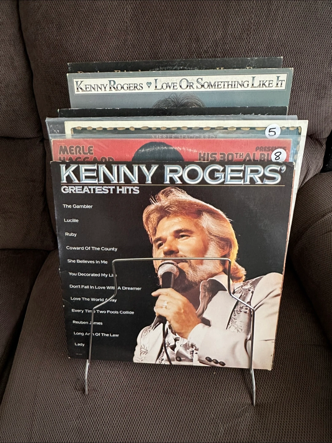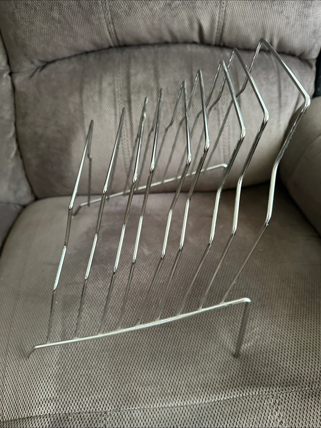 849Chrome-plated metal record album rack. Holds approximately 12-14 LPs. Great for displaying your collection. Shows minor wear from use. Smoke free home. LPs not included.