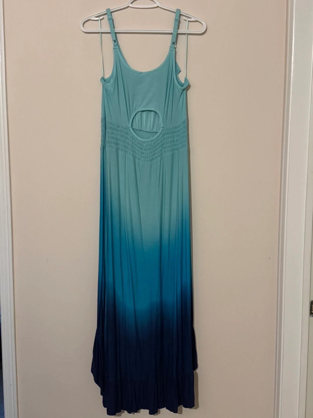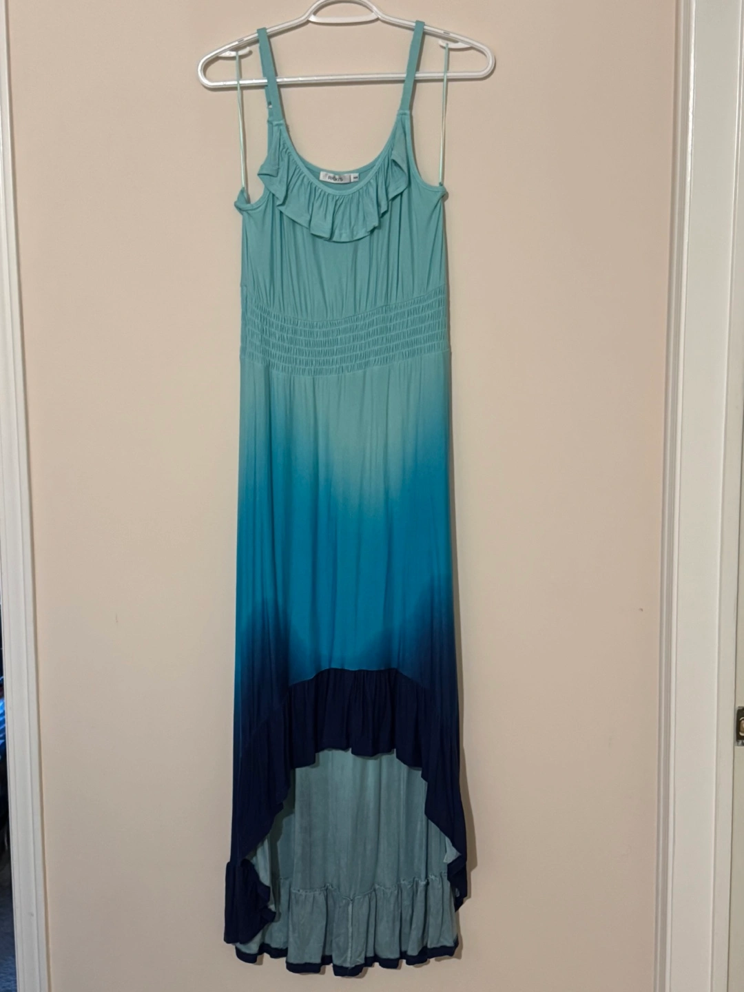 Beautiful ombre maxi dress. Features a ruffled neckline, spaghetti straps, and high-low hemline. Cut out in the back. Soft and stretchy material. Perfect for summer. No tags but never worn.