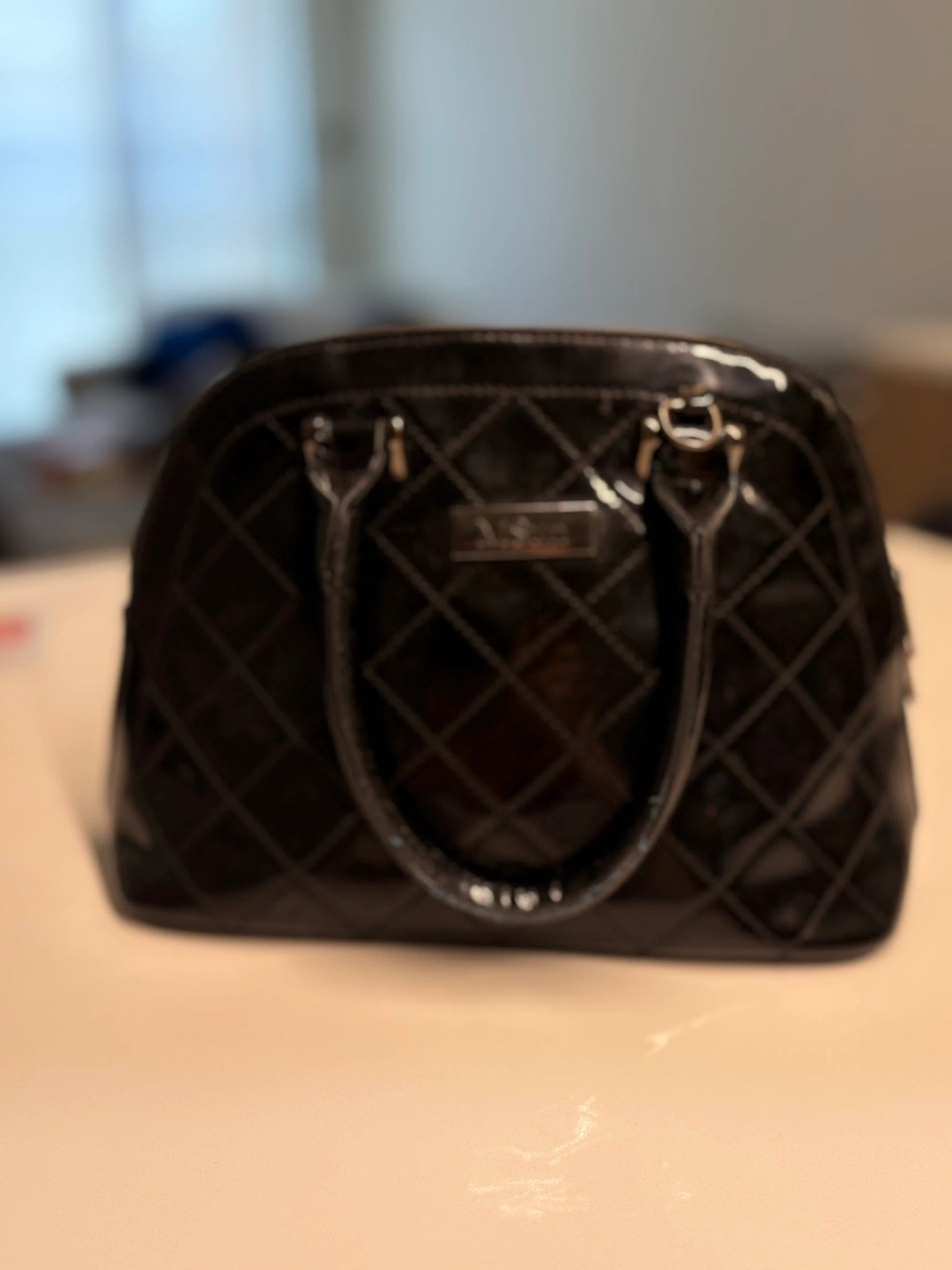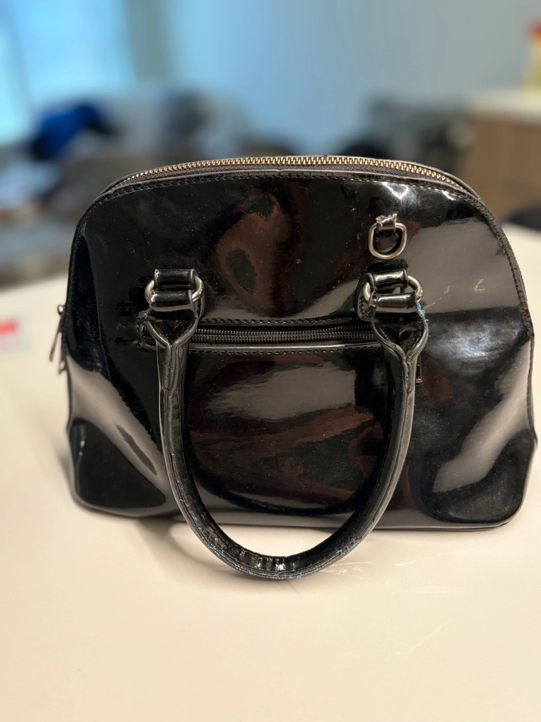 Small black patent handbag. Features a top zipper closure and two short handles. Minor wear and tear on the handles. Interior lining shows some staining.