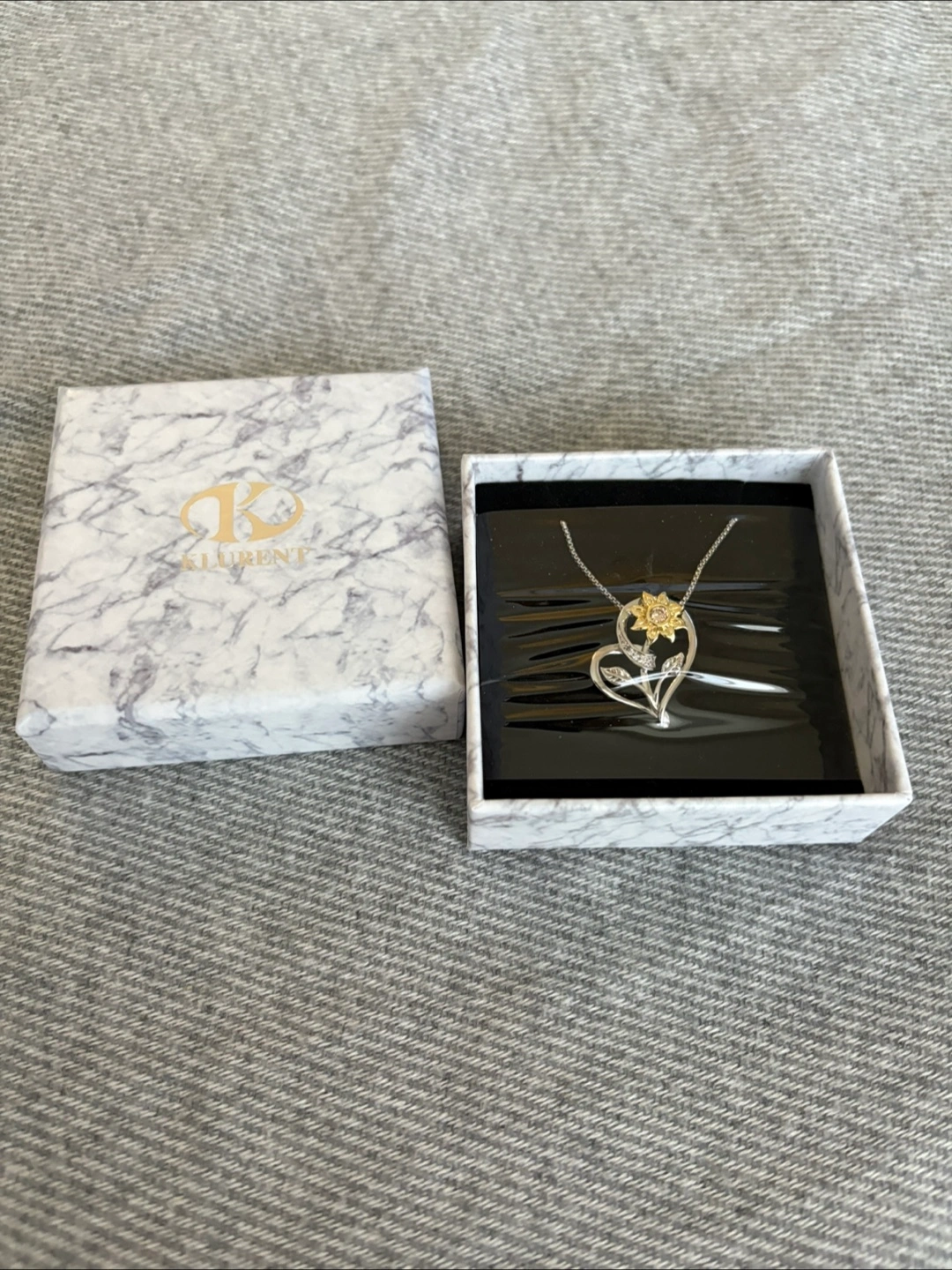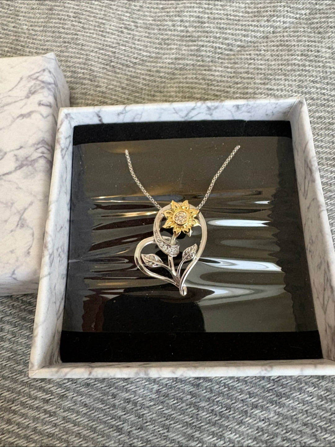 Beautiful sunflower pendant necklace. Silver chain and heart design. Gold-toned sunflower accents. Comes in a nice box. Perfect gift.