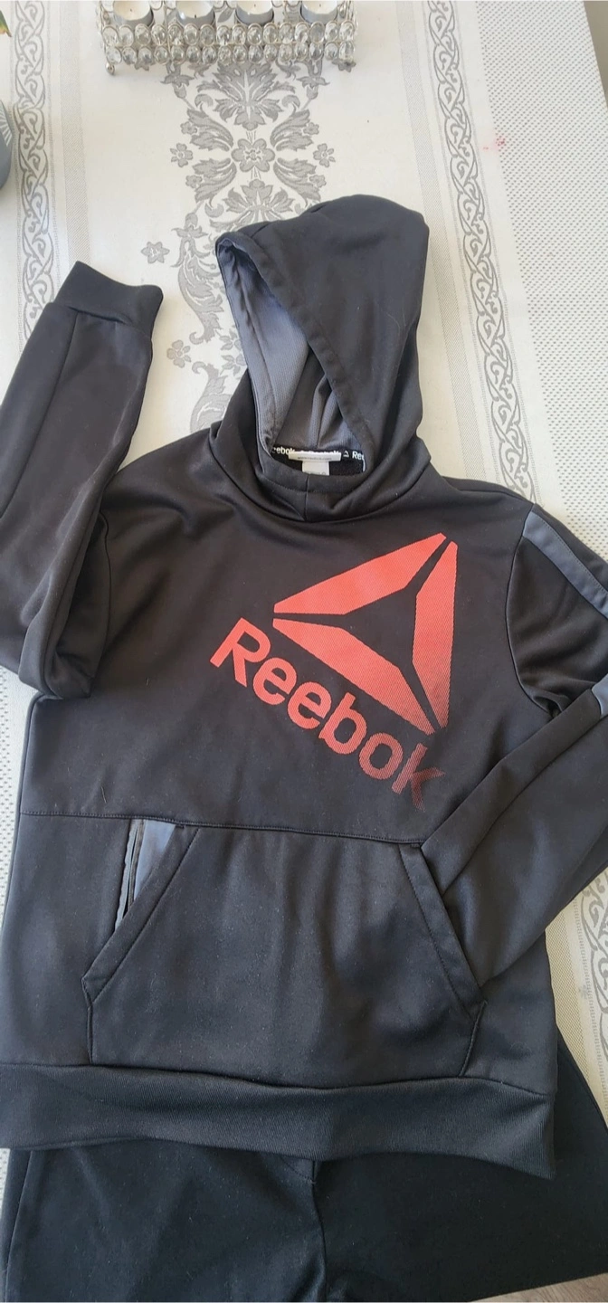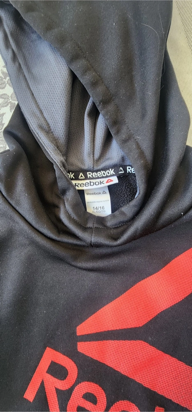 Black Reebok hoodie. Size 14/16. Red logo. Grey interior hood. Front pouch pocket.