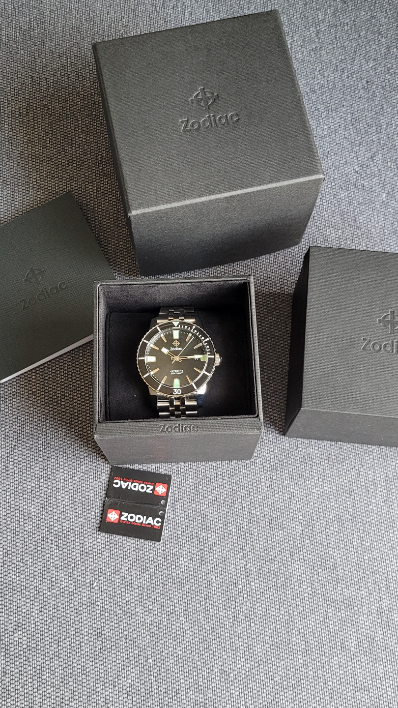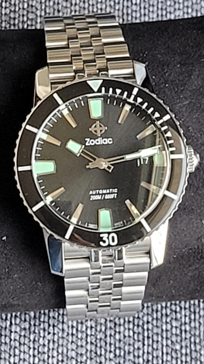 Men's Zodiac Sea Wolf automatic watch. Stainless steel bracelet. Black dial. Comes with original box and papers. 200m/660ft water resistance.