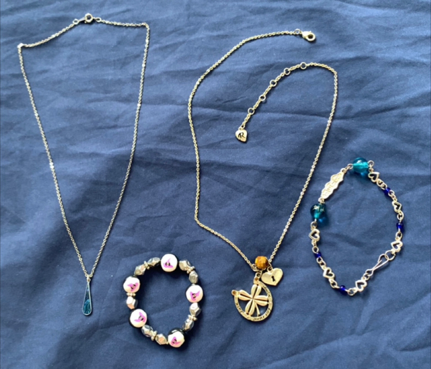 Set of five silver-toned jewellery pieces in bundle. Blue teardrop necklace. Necklace with irish theme of four leaf clover, horseshoe, heart with lock and key and amber like stones also has a heart with an R cutout. (appears more gold) Small bracelet appears to have purple witches type hats on each white stone. Bracelet with blue gemstones says CUBA