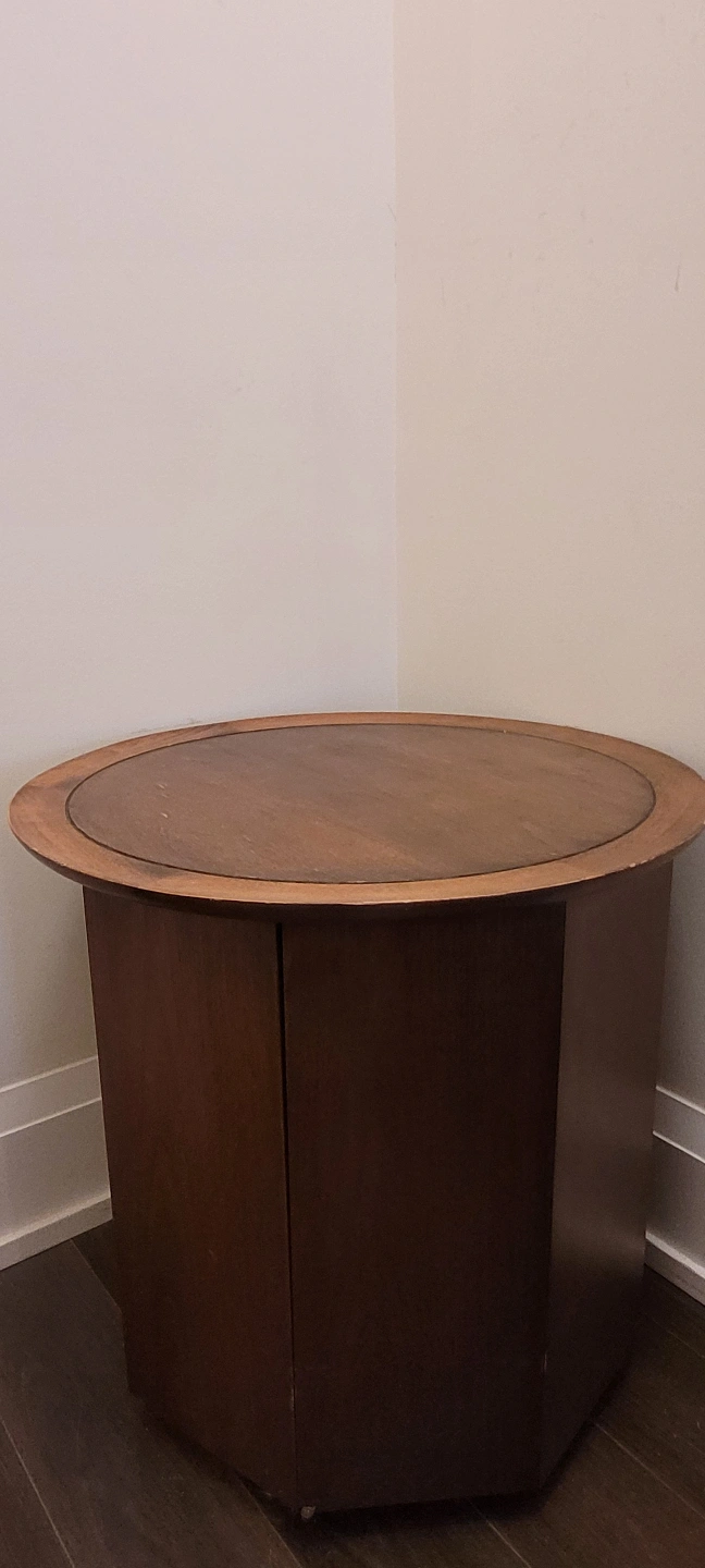 Round corner table. Features a door revealing storage. brown wood finish. Perfect for a mid-century modern or retro-inspired space. Shows some signs of wear.