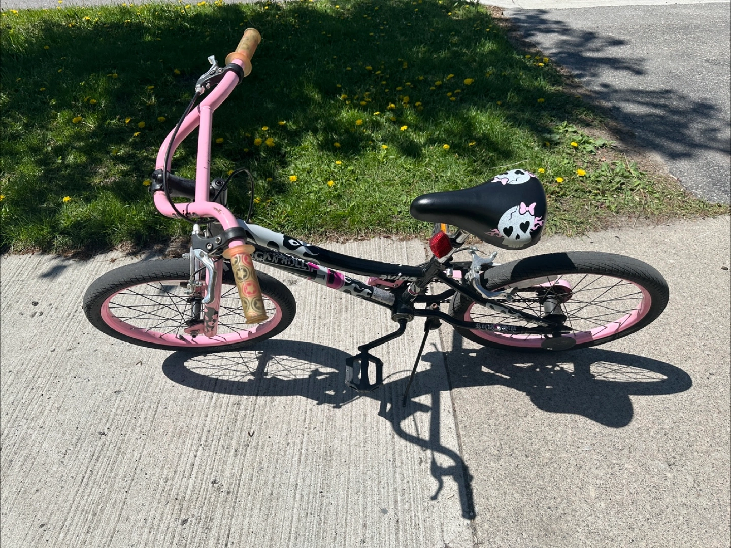 Pink and black girls' bicycle. Features flames and skull graphics. Good used condition. 20-inch wheels. Has kickstand and hand brakes with a smooth ride!