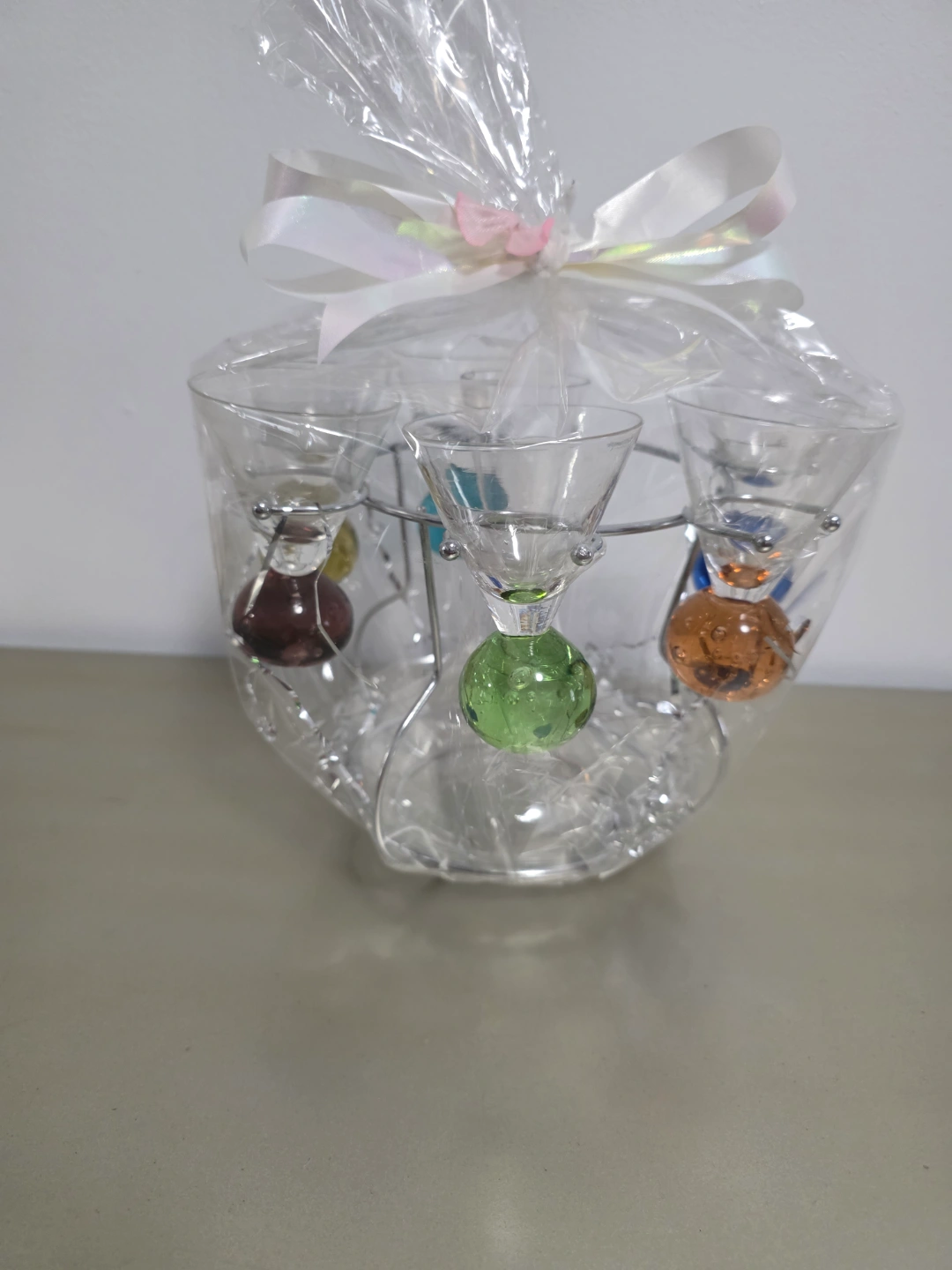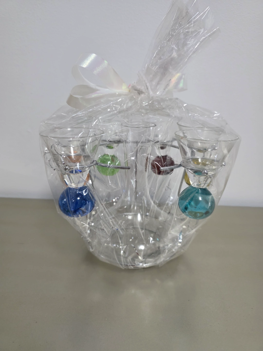 Six shot glasses, colourful bases with decanter Metal stand. New in plastic packaging. Perfect for parties or gifts.