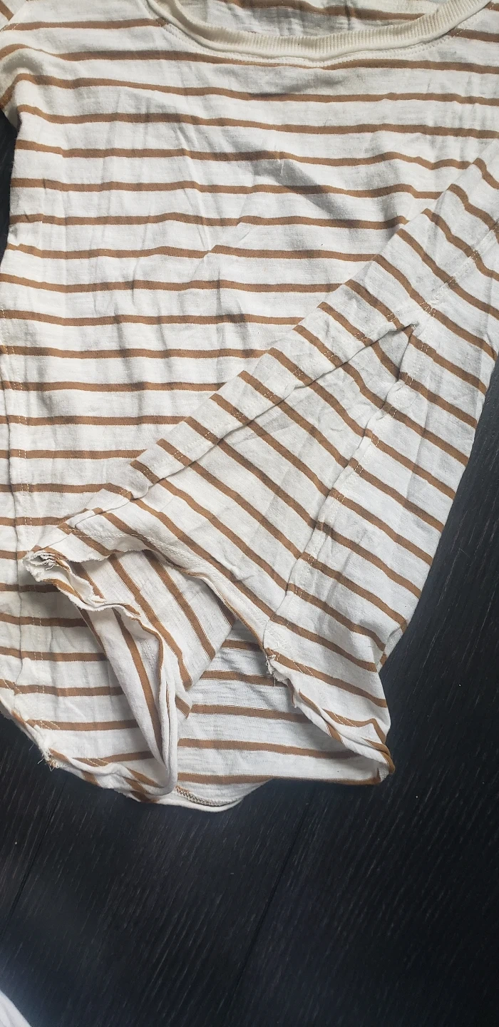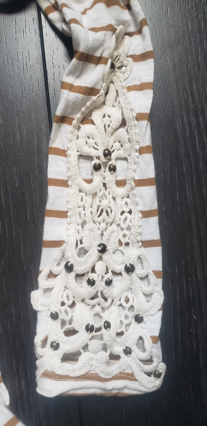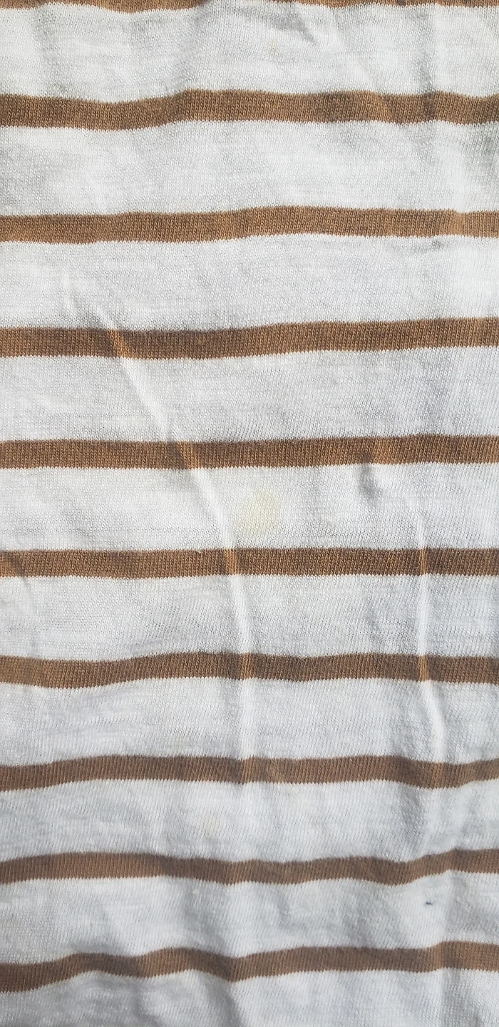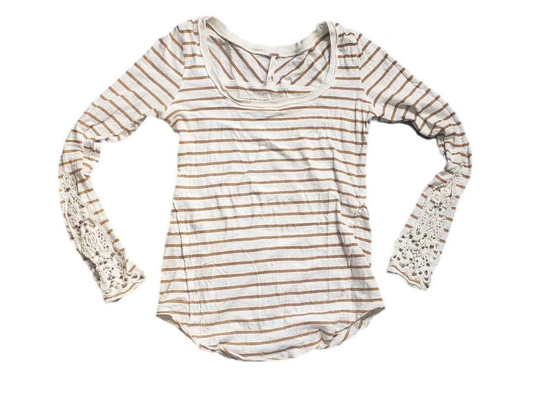 brown and white striped long sleeve tee, size xs but fits small comfortably. scoop neck and western lace detailing on lower arms--throwing Chloe vibes. in GUC, small stain on front that is barely noticeable but calling out (see pic).