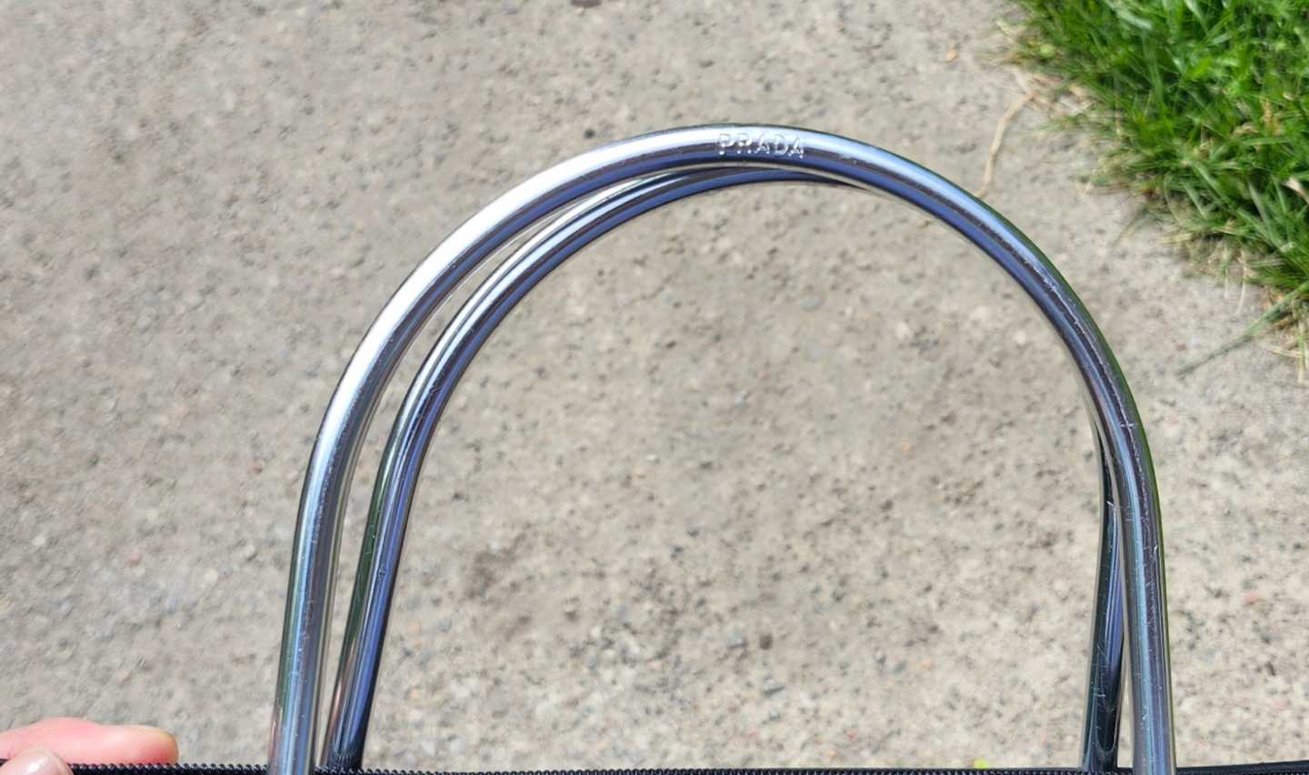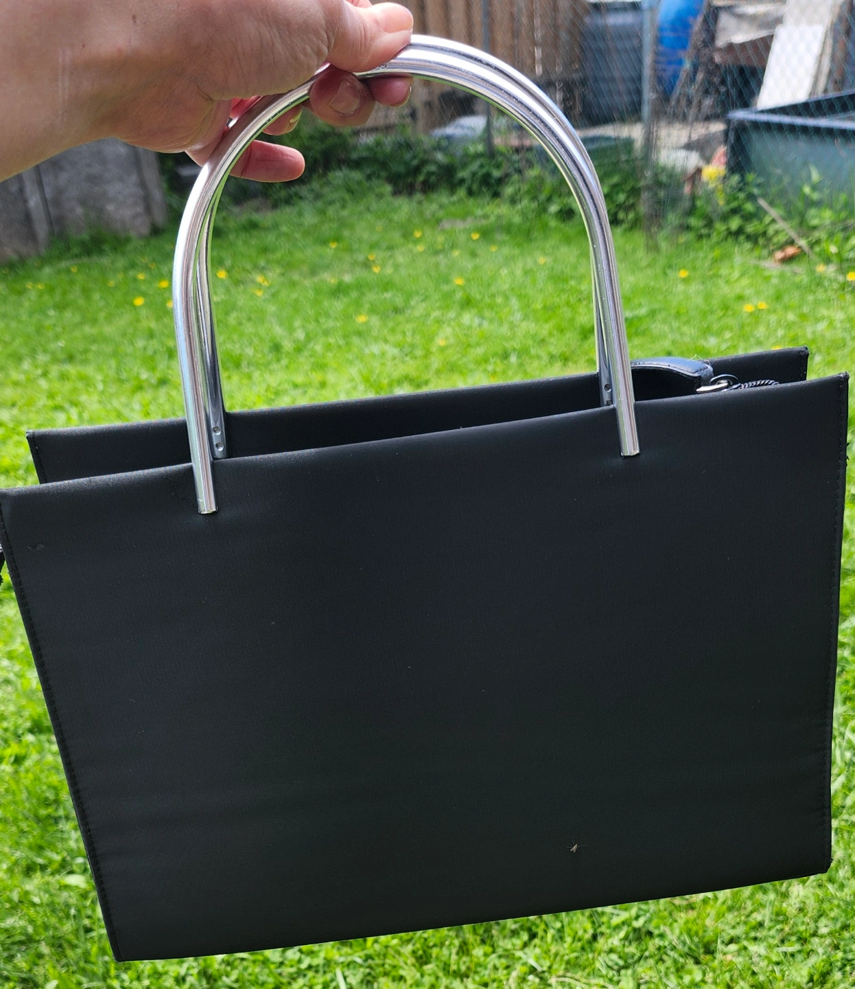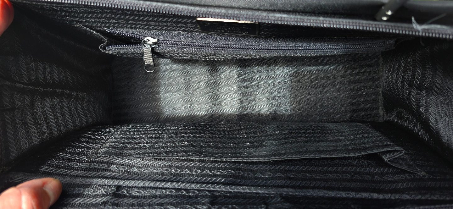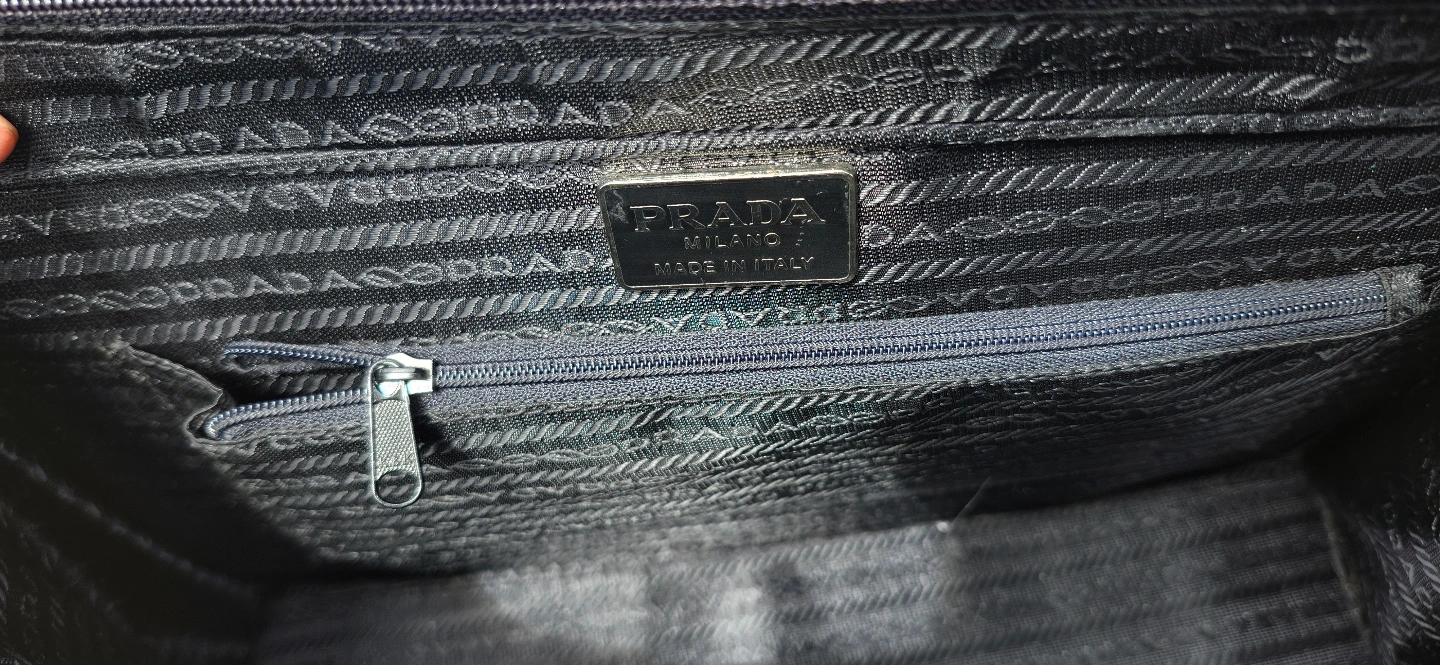 Pre-owned Prada tote bag. Black nylon exterior. Silver metal handles. Interior features a zippered pocket. Handle shows some wear.