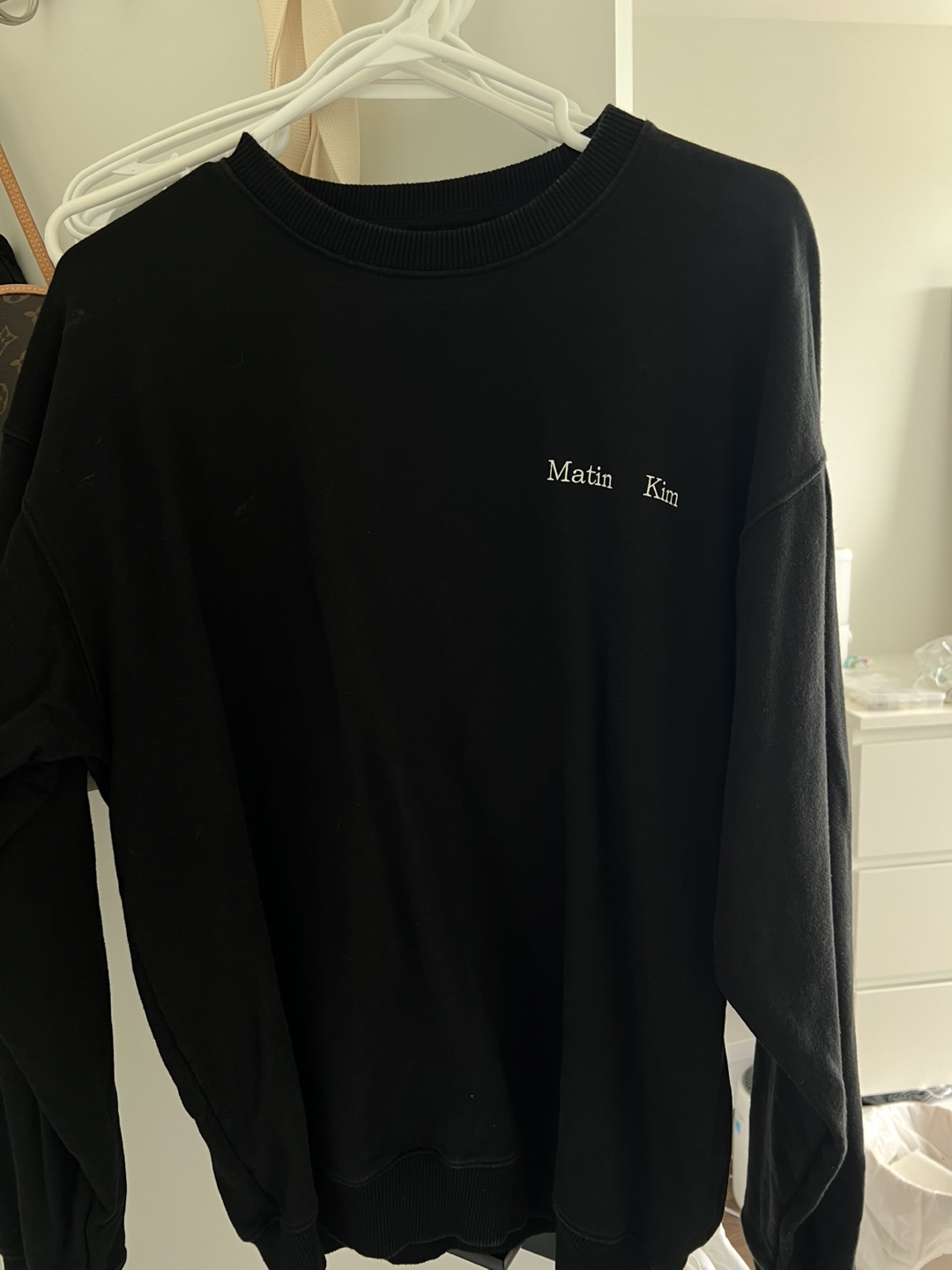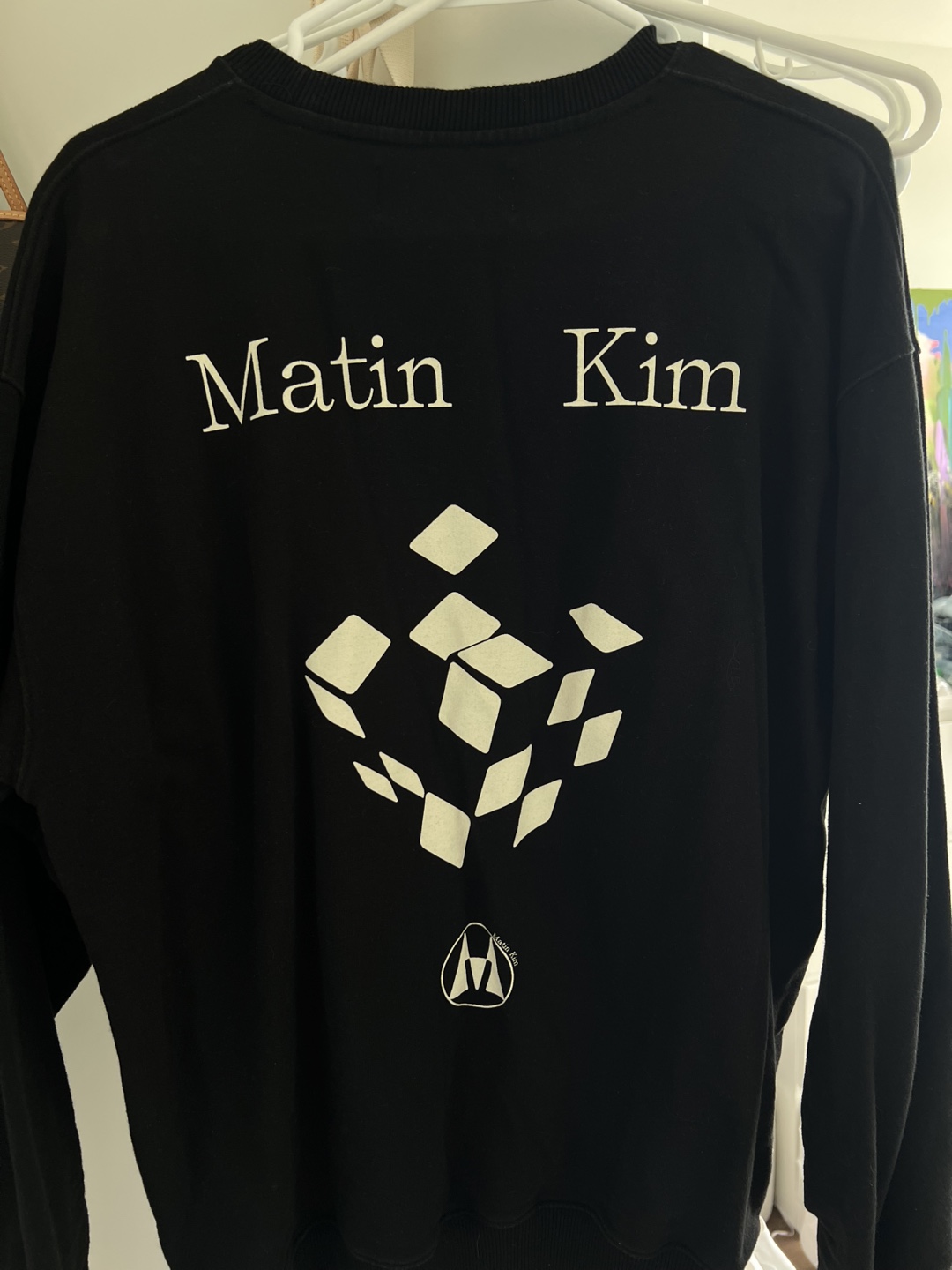 Black Matin Kim crewneck sweatshirt. Features a small logo on the front and larger logo on the back. Long sleeves, relaxed fit.