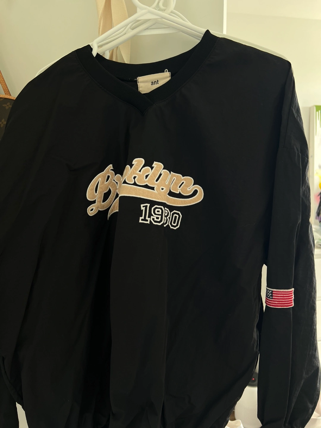 Lightweight black jacket. Features a V-neck, long sleeves, and embroidered Brooklyn 1930 design. Small American flag patch on the sleeve. Relaxed fit.