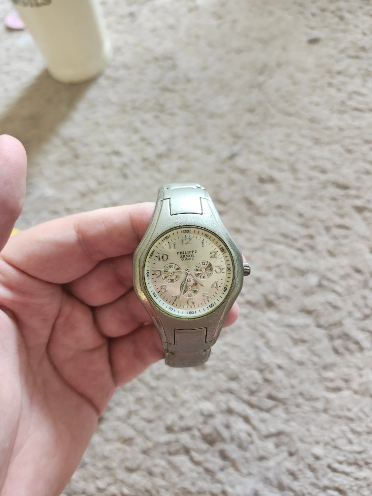 Silver tone metal wristwatch. Quartz movement. Features chronograph subdials. Cream coloured face.