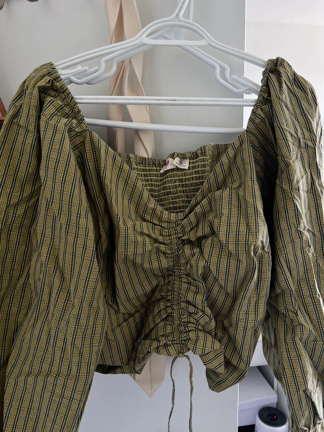 Women's olive green and black checked peasant top. Long sleeves, smocked back, cropped length. Square neckline.