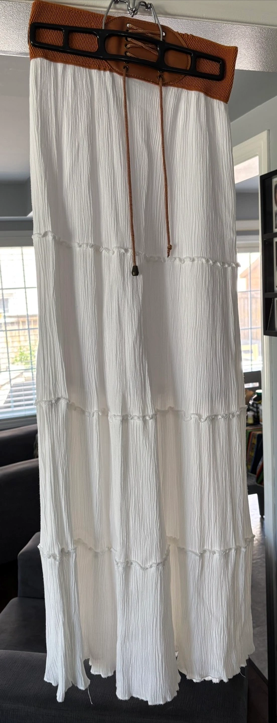 Lovely white tiered maxi skirt. Features a drawstring waist and multiple layers. Lightweight and flowy fabric. Perfect for summer.
