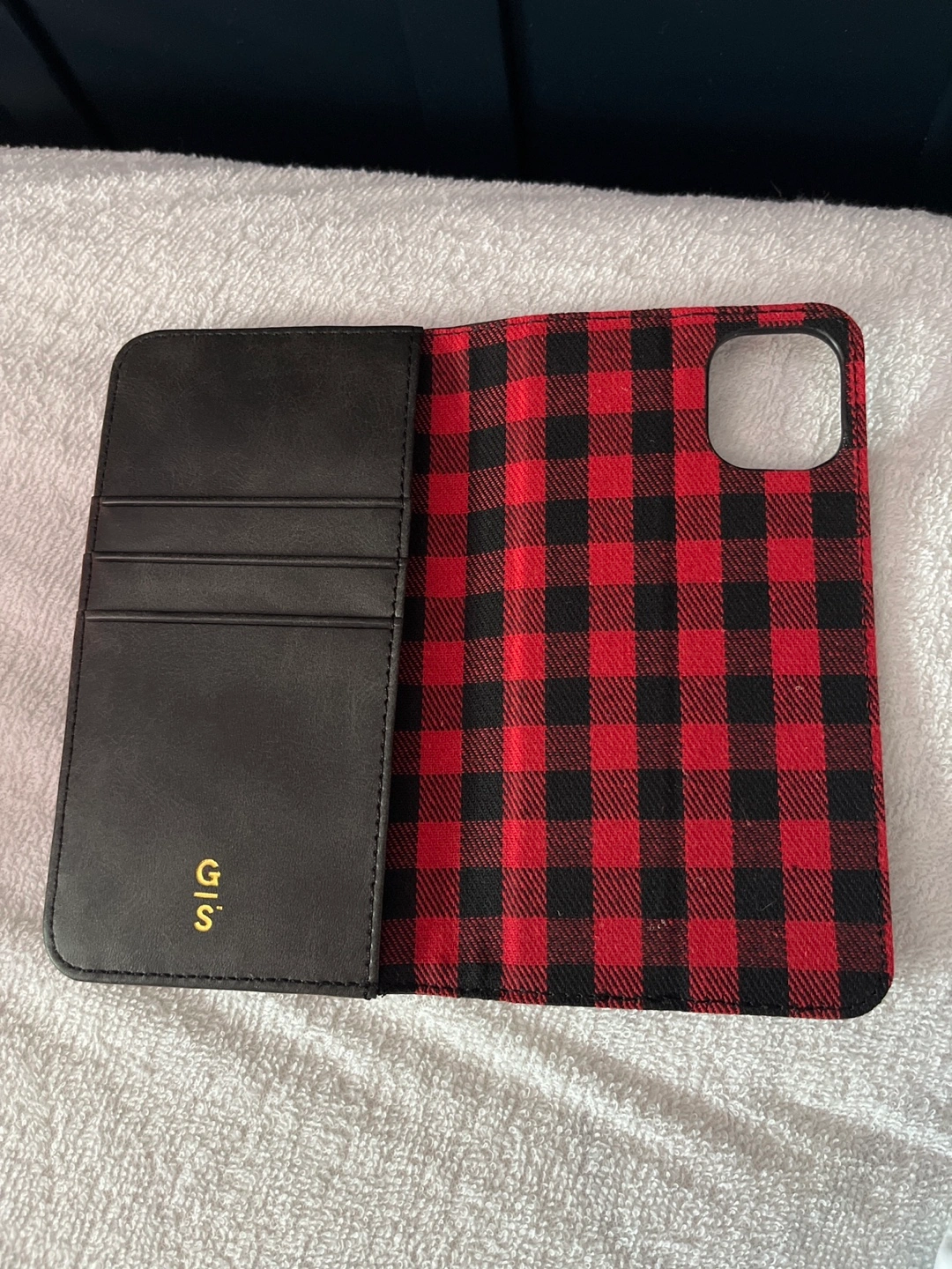 Stylish wallet phone case. Features a black leather exterior and a red buffalo plaid interior. Holds cards. Compatible with iPhone 12 or 13 Pro Max.