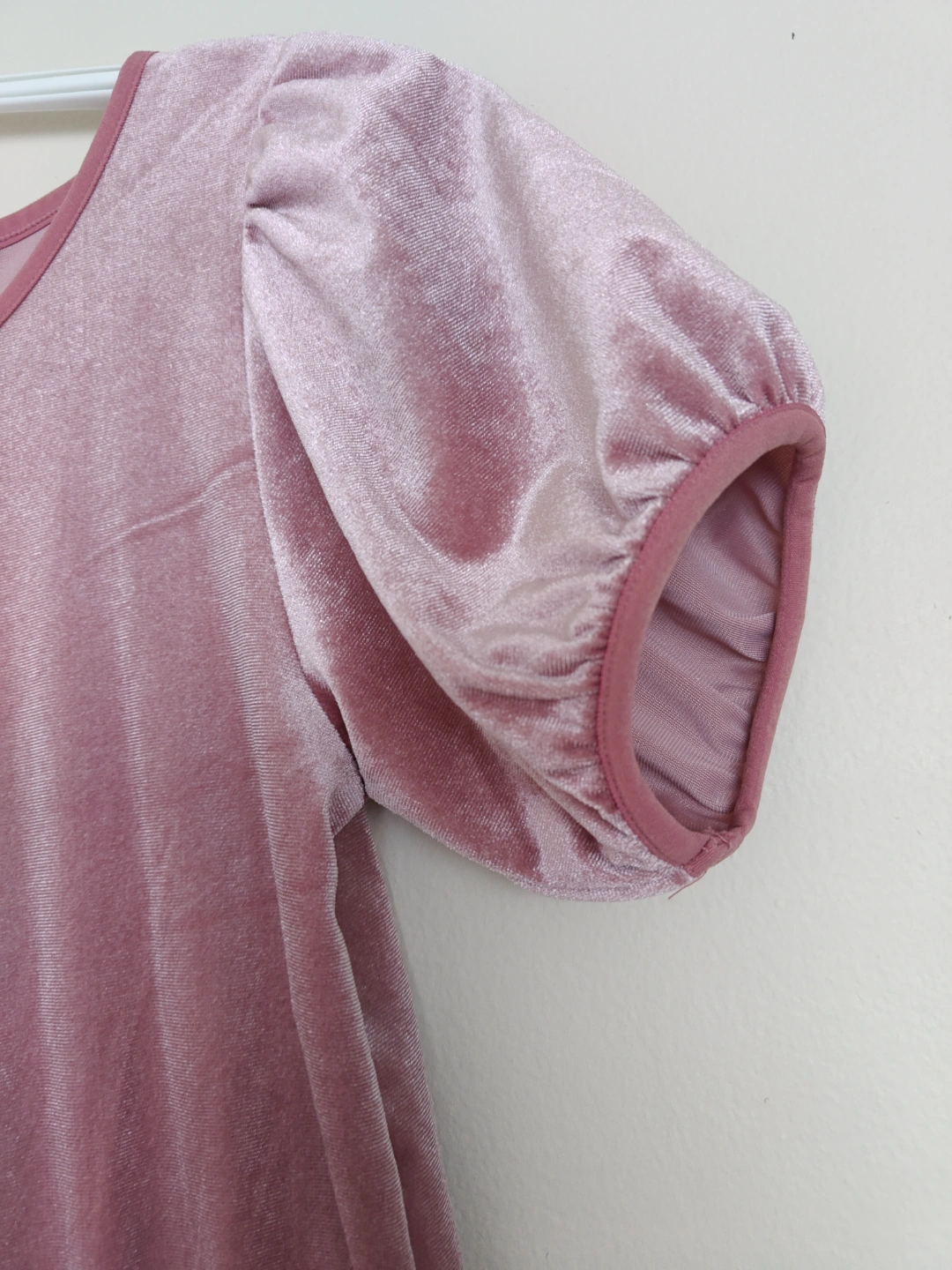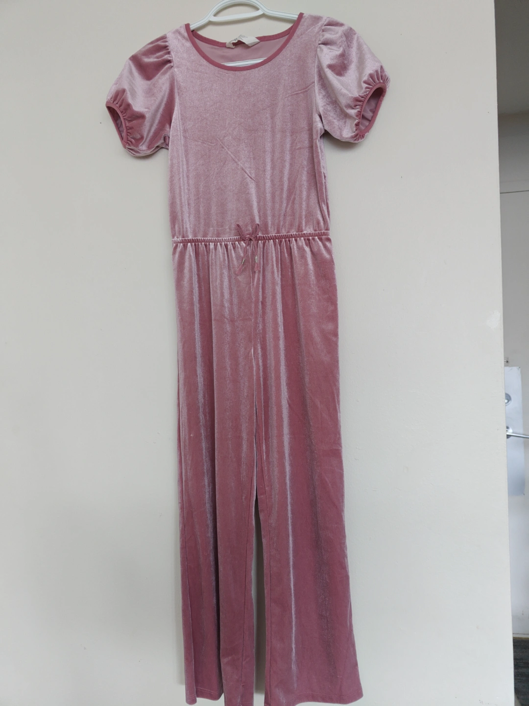 Dusty rose velour jumpsuit. Elastic waist with drawstring. Puff sleeves. Relaxed fit. Size 10.