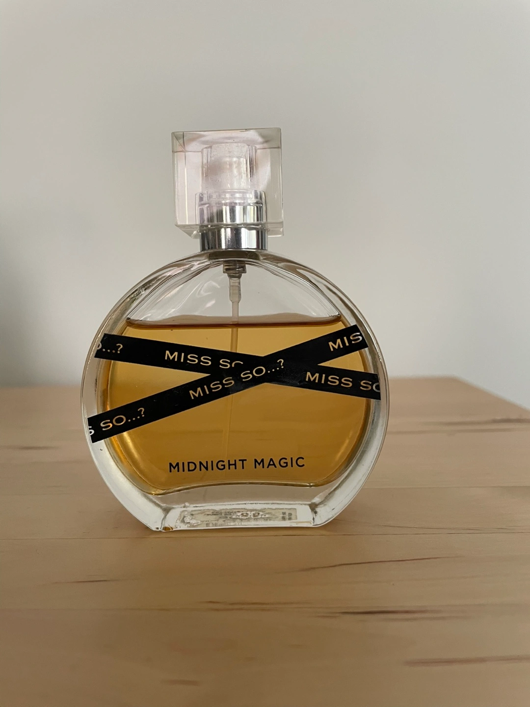 Vintage perfume 50ml bottle. Midnight Magic Miss So…? fragrance. Clear glass bottle with black ribbon accents. Slightly used.