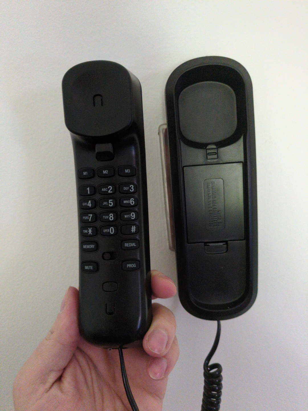 Black corded telephone. Wall mountable. Features include redial, mute, and memory buttons. Digital display. Good condition.