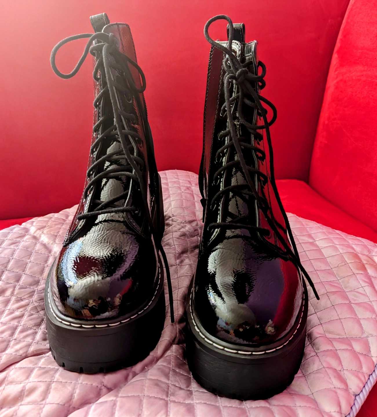 Women's black patent faux leather platform boots. Lace-up and side zipper closure. Thick platform sole. Excellent for adding height and style to any outfit. Brand new as in never worn.