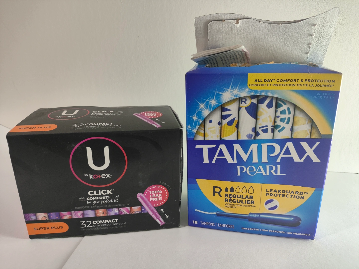The other box (opened but unused) is Tampax Pearl, 18 regular tampons. LeakGuard protection.