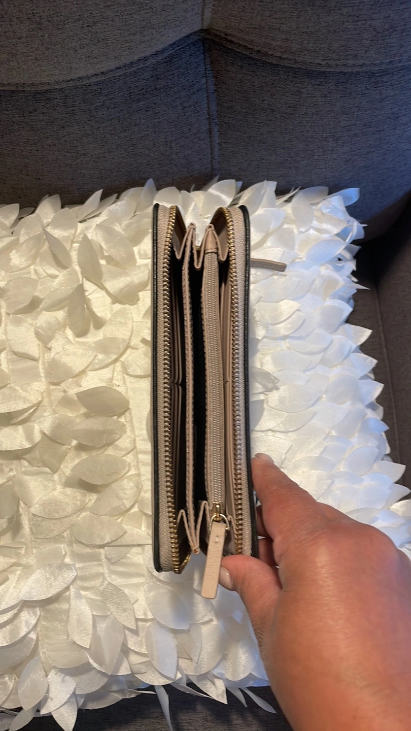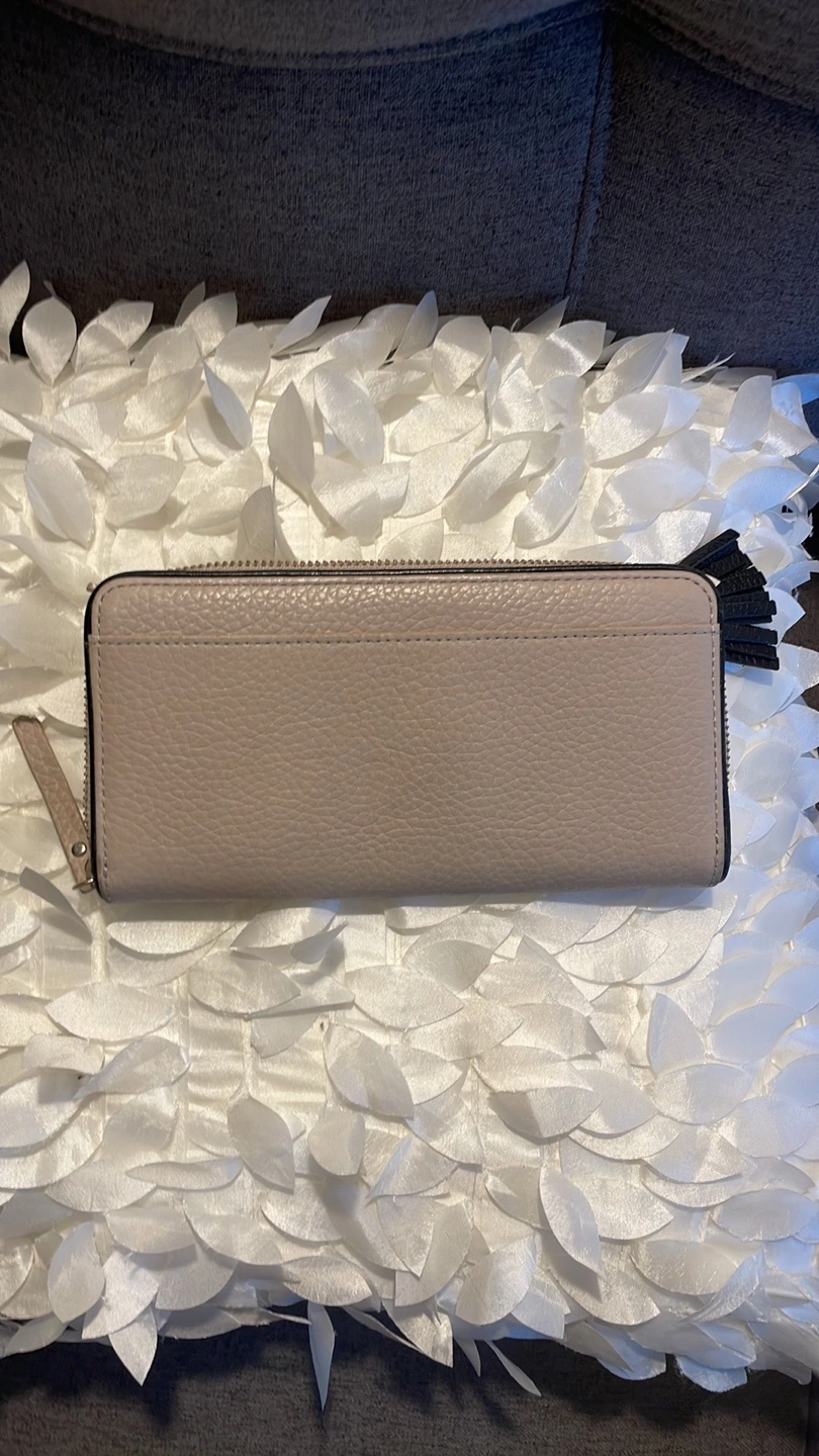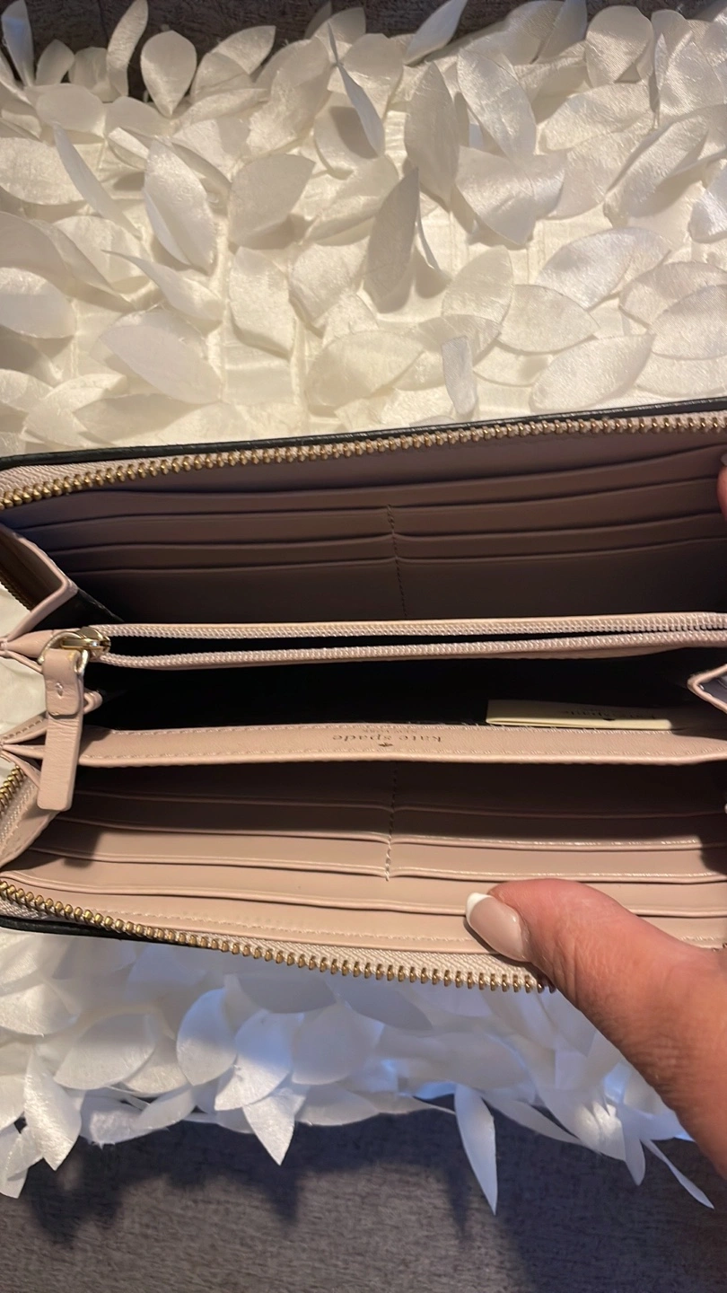 Pale pink leather zip around wallet. Features multiple card slots and compartments. Gold-toned hardware. Zip closure. ok condition